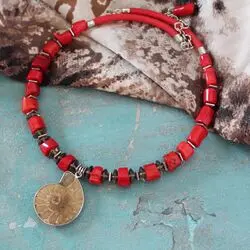 Ожерелье из натурального красного коралла, аммонита, каучука.