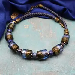 Ожерелье из афганского лазурита, муранского стекла, натуральной плетенной кожи, бронзы.