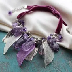 Ожерелье из природных аметистов разных оттенков и огранок, металлизированные (гальваника) природные листья, бархатная лента.