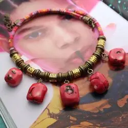 Ожерелье из натурального крупного розового коралла, узорного текстильного шнура, позолоченной латуни, бронзы.