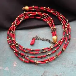 Ожерелье из натурального красного коралла, золотого, серебренного гематита, позолоченной латунной фурнитуры (Чехия).