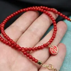 Ожерелье из натурального красного коралла (Индонезия), подвески в виде спелого плода граната с красной эмалью.