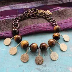 Ожерелье из натурального крупного тигрового глаза, позолоченной фурнитуры в види стилизованных монеток, цепи с цветным рисунком.