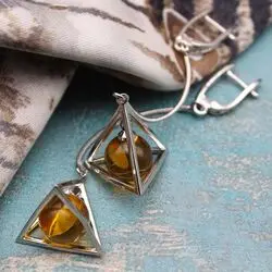 Серьги из балтийского янтаря, посеребренного сплава, серебра с родиевым покрытием.