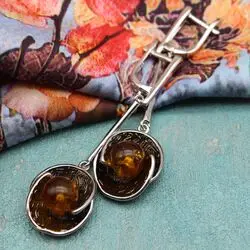 Серьги из балтийского янтаря (каленого), посеребренного сплава, серебра с родиевым покрытием и чернением.