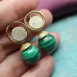 Серьги с натуральным малахитом (р-ка Конго), позолота 24К с микроцирконами.