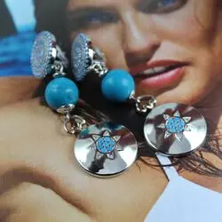 Серьги из бирюзы (стабилизированной), посеребреной родированной фурнитуры, серебра 925, инкрустированной бесцветными и голубыми цирконами.