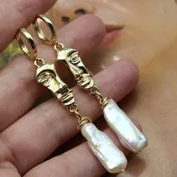 Серьги из натурального барочного жемчуга, позолоченной латуни 24К в виде полумасок (Корея).