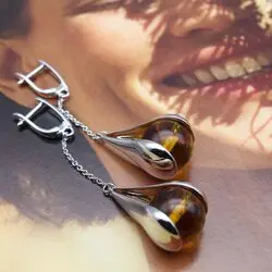 Серьги из медового балтийского янтаря (г. Калининград), посеребренного сплава, серебра с родиевым покрытием.