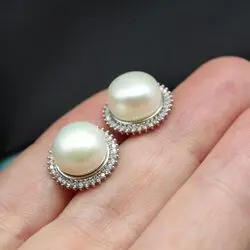 Серьги из натурального белоснежного речного жемчуга, прозрачных цирконов.