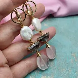 Сеьги из натурального граненого розового кварца (Шри-Ланка), барочного жемчуга, дымчатых кристаллов, позолоченной 24К фурнитуры.