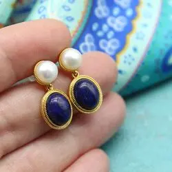 Серьги из натурального белого жемчуга, лазурита, позолоченного сплава.
