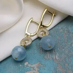 Серьги из крупного природного граненого аквамарина, цирконов, позолоченной 24 К фурнитуры.