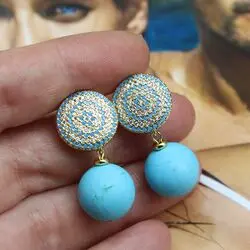 Серьги из бирюзы (стабилизированной), позолоченной 24К родированной фурнитуры, серебра 925, инкрустированной бесцветными и голубыми цирконами.
