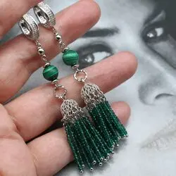Длинные серьги - кисточки из натурального малахита, зеленой шпинели, посеребрение 925, серебра 925 пробы с микроцирконами.