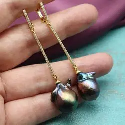 Серьги из натурального черного жемчуга барокко с золотистыми, изумрудными, лиловыми оттенками, позолоченной фурнитуры 24К с родиевым покрытием и микроцирконами.