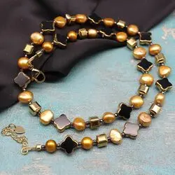 Ожерелье из натурального жемчуга барочной формы золотистого цвета, гематита, богемского стекла, позолоченной фурнитуры 24К.