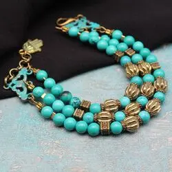 Многорядный браслет из бирюзы (восстановленная), гематита, латуни, бирюзы.