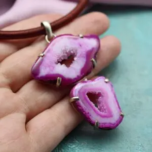 Подвески из друзы очень неординарны и привлекательны, отличаются яркой индивидуальностью! Друза сама по себе прекрасна и гармонична, как явление Природы, а в руках мастера становится настоящим драгоценным материалом для украшений. В подвесках для достижения наибольшего "эффекта необычности" могут использоваться окрашенные фрагменты друзы кальцита, кварца, аметиста! В сочетаниях с другими камнями друза таккже выглядит очень экзотично и не банально!