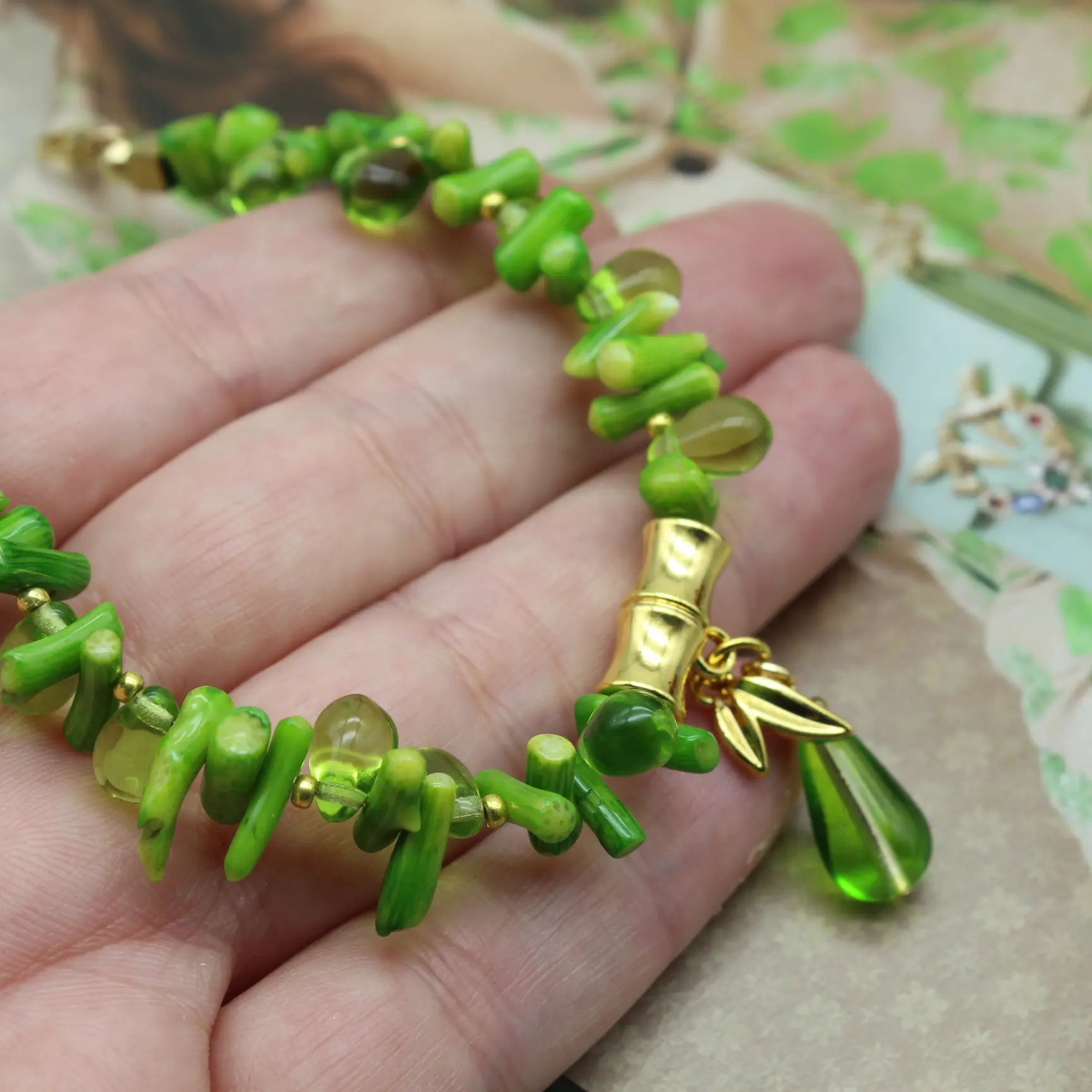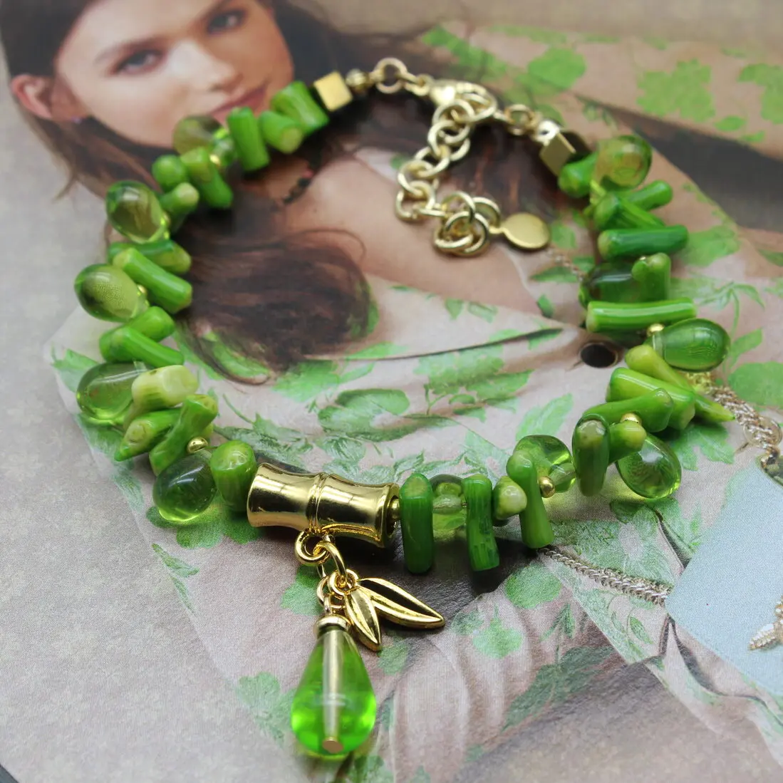 Браслет из натурального коралла, тонированного в красивый зеленый оттенок, богемского стекла, позолоченной 24К латунной фурнитуры.