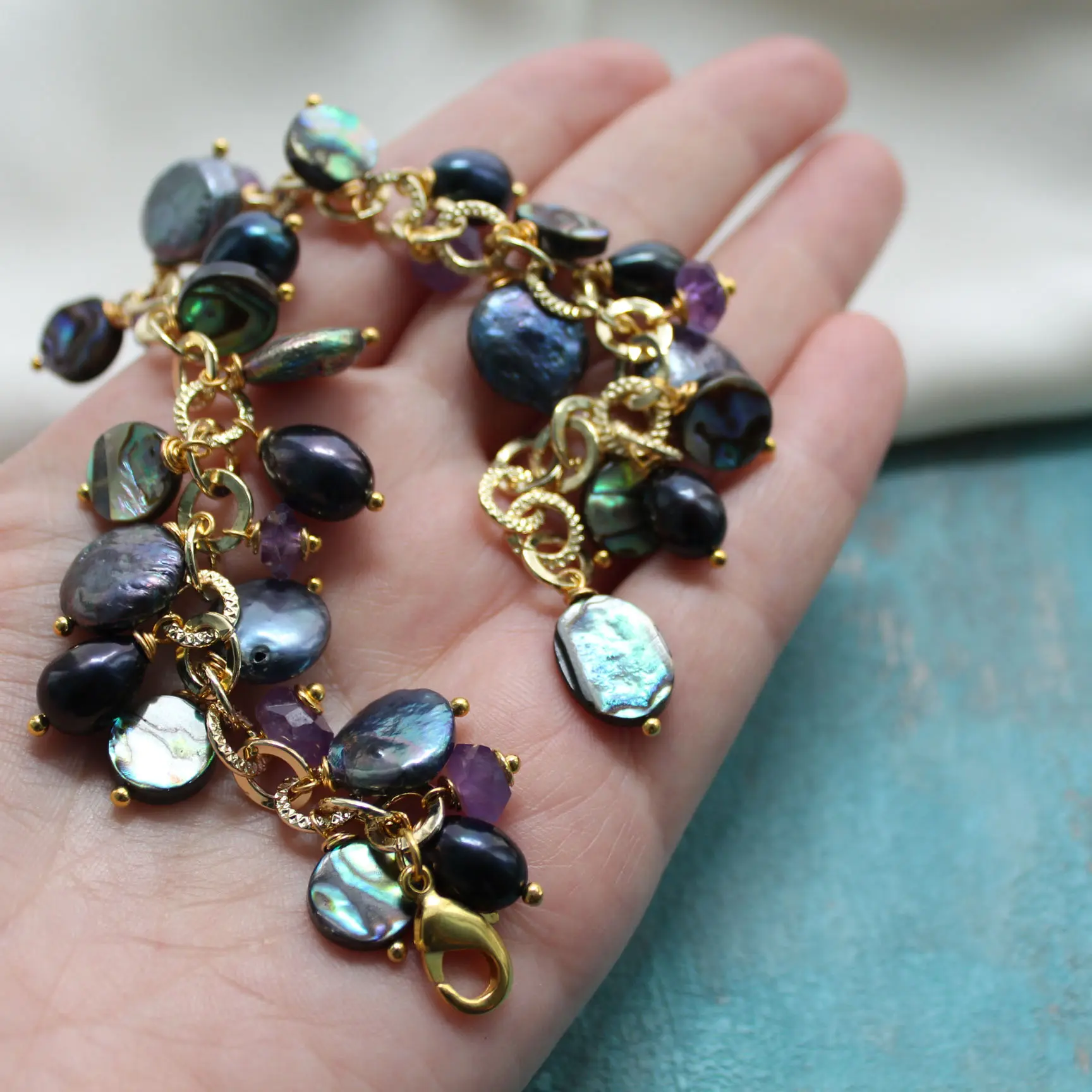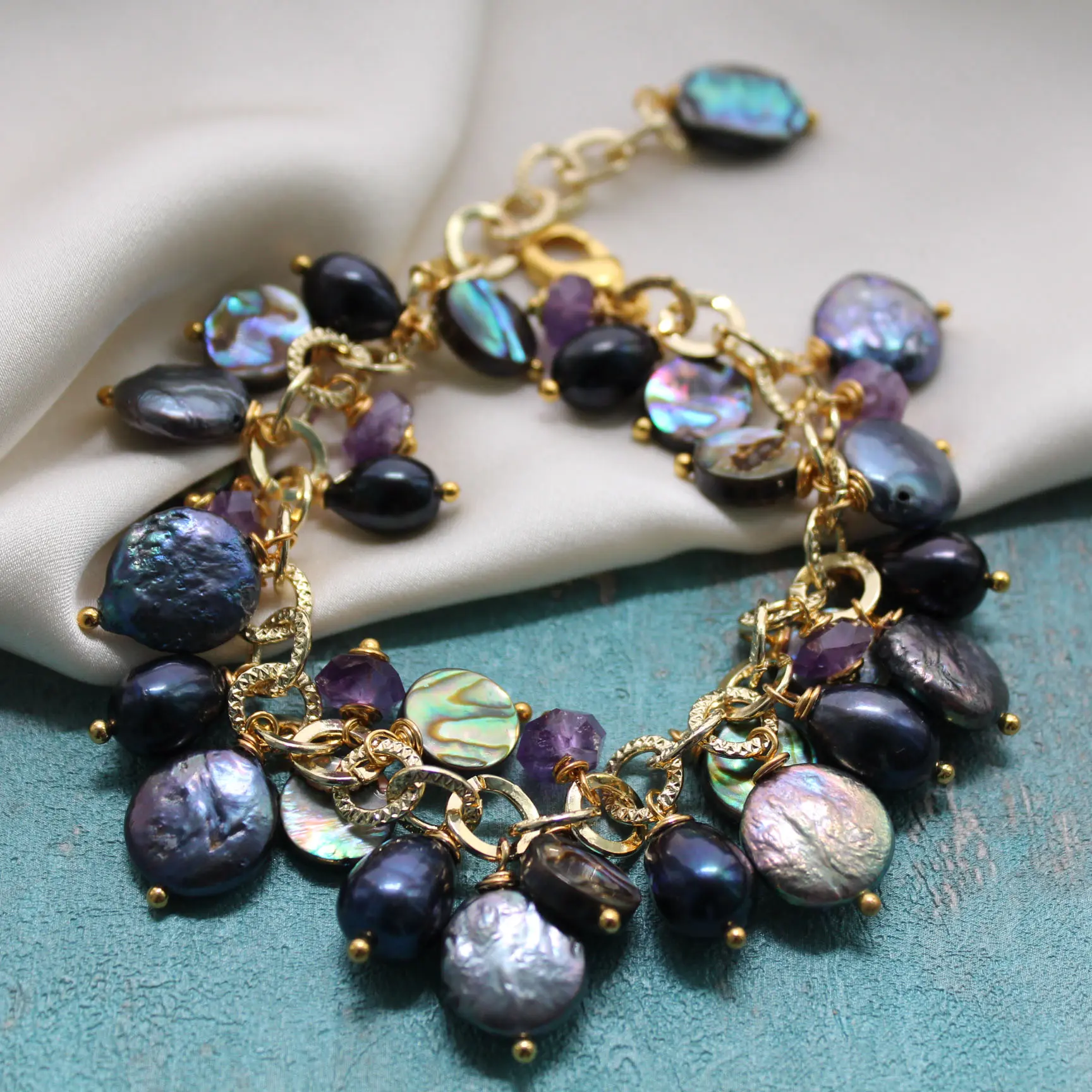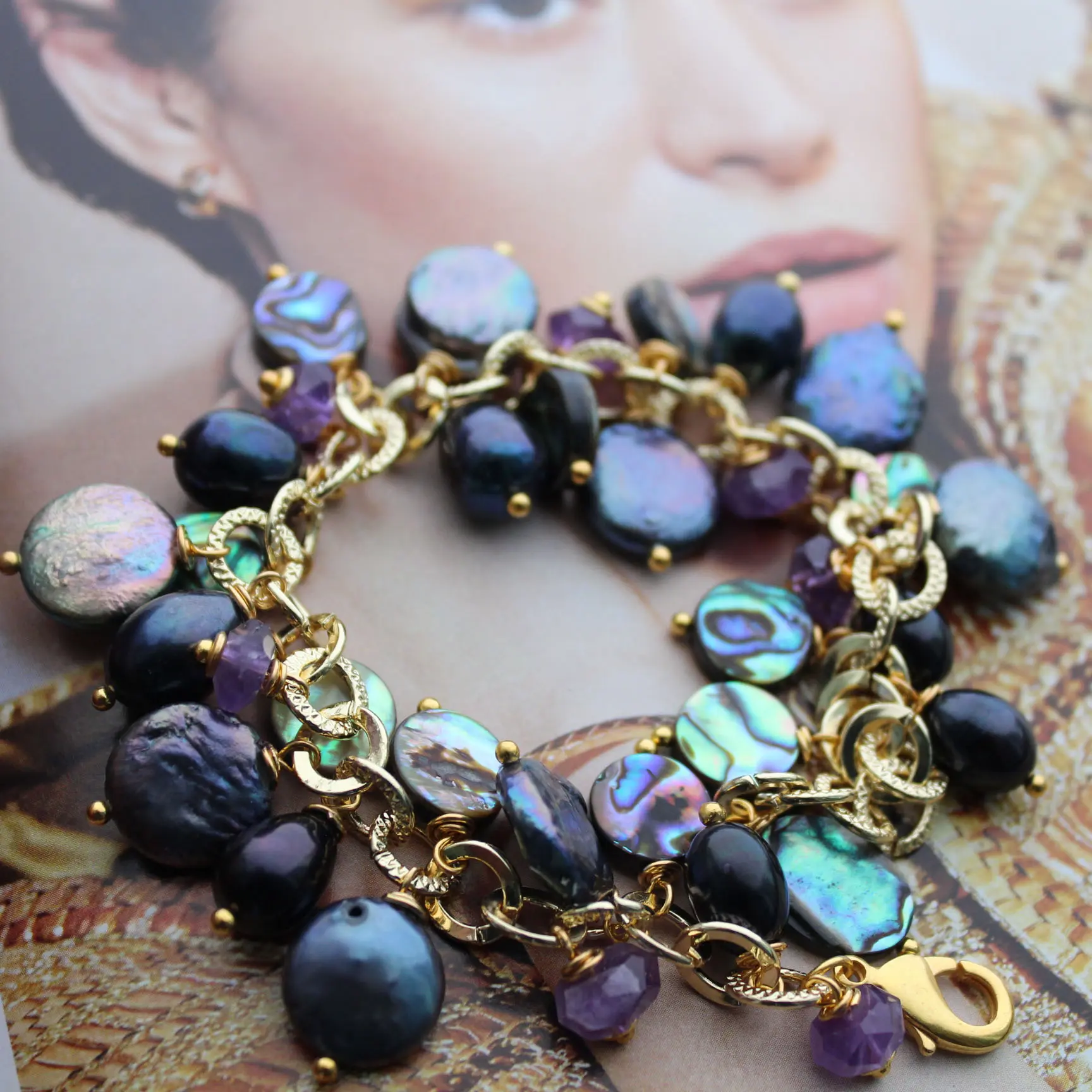 Браслет из натурального черного жемчуга двух видов, гелиотиса, аметиста (Бразилия), позолоченной родированной фурнитуры 24К.