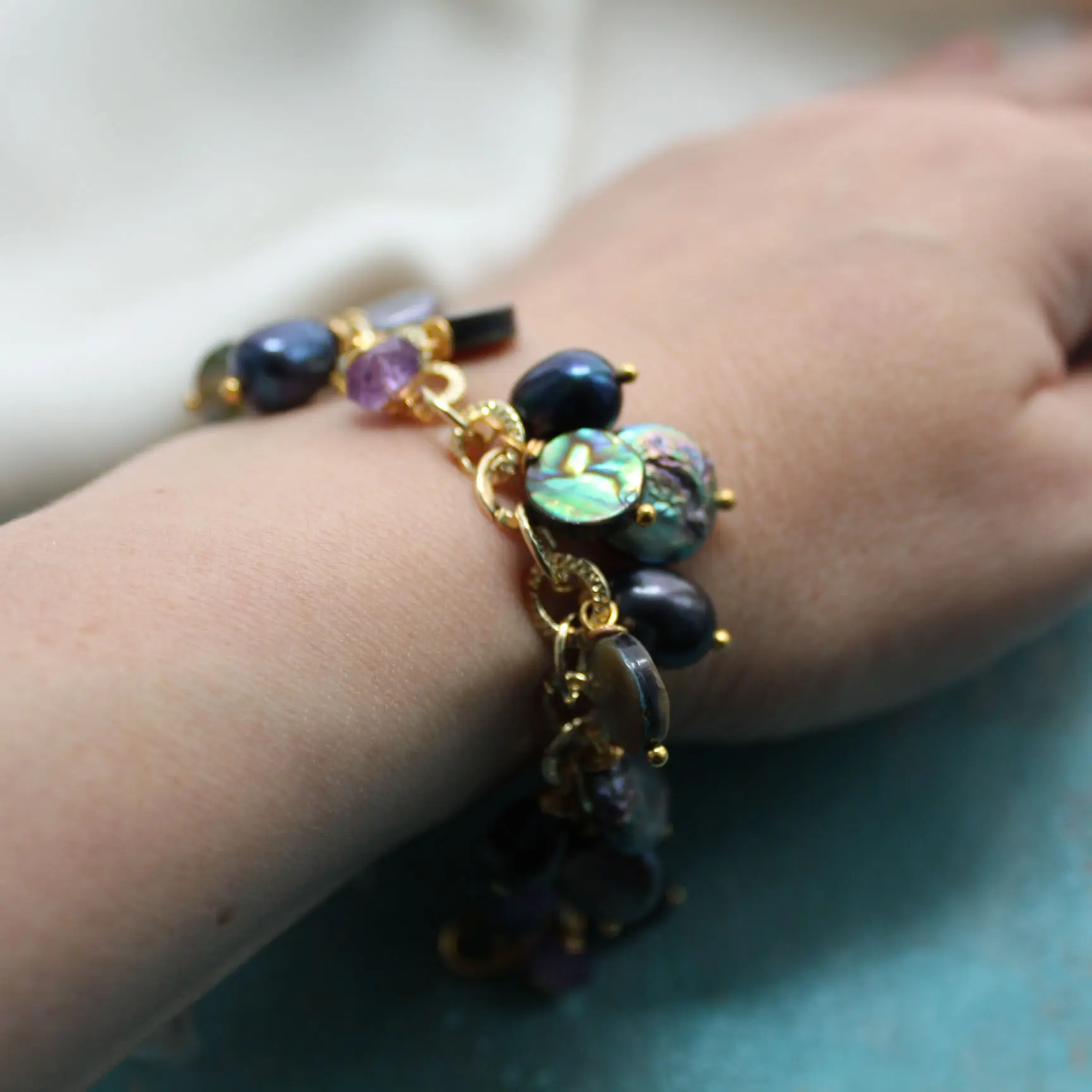 Очень красивый браслет из природных самоцветов - черного жемчуга, гелиотиса, аметиста! Невозможно не обратить внимание на это потрясающее украшение!