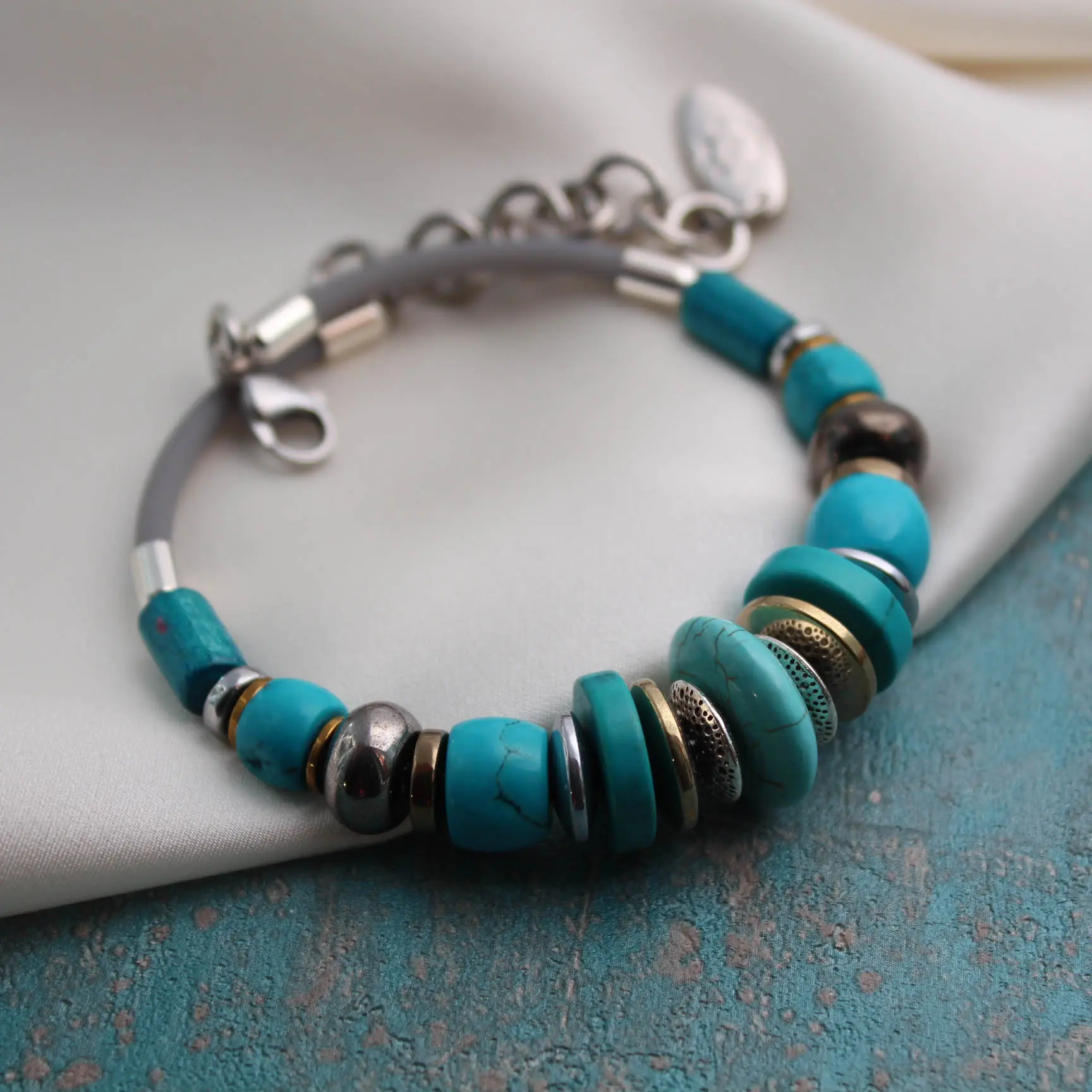 Браслет из бирюзы (турквенита), дерева, гематита, каучука.