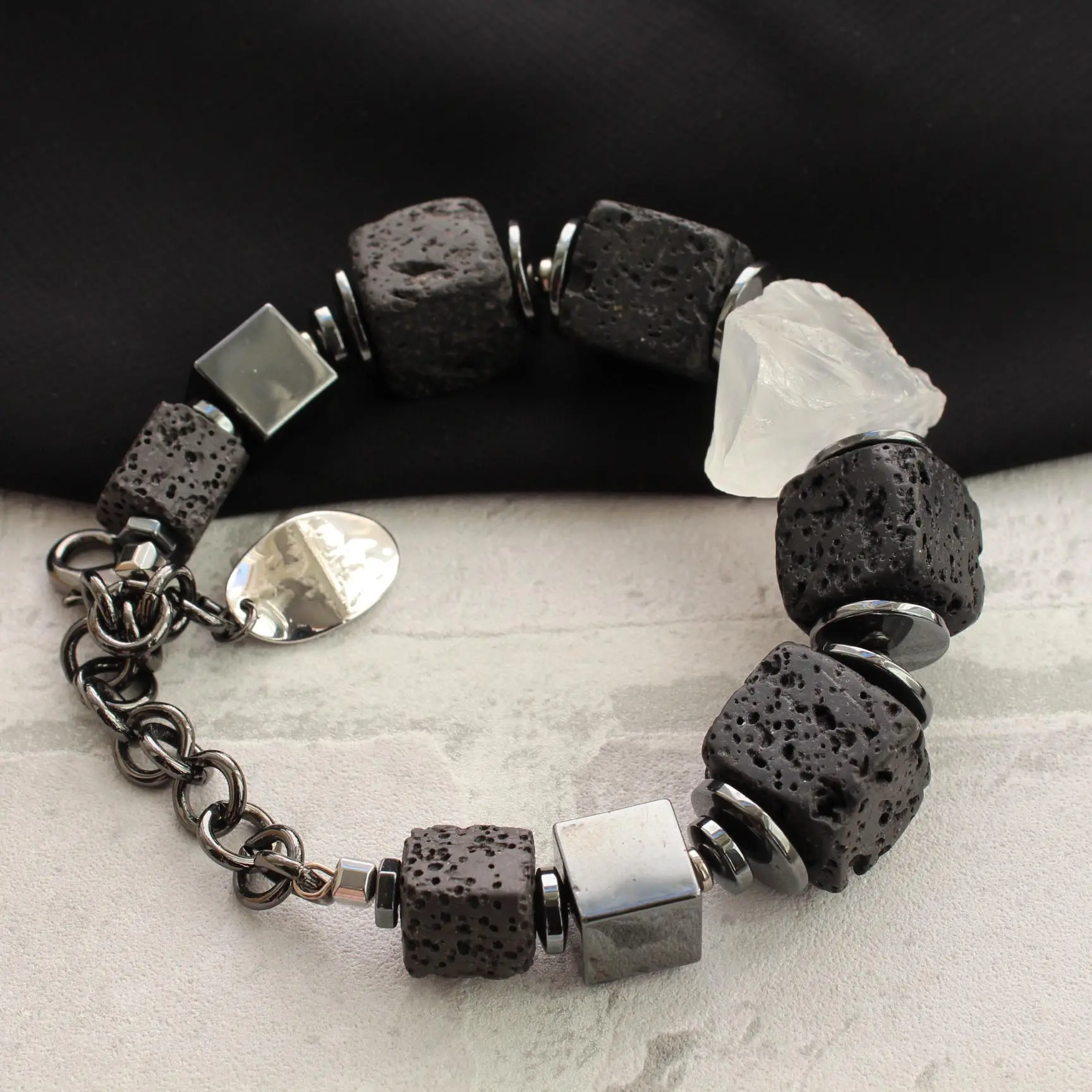 Размер горного хрусталя 15*22*27 мм, лавы 15*15 мм, 10*10 мм, агата 10*10 мм.