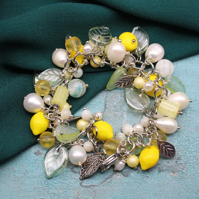 Очень симпатичный, "радостный", яркий браслет! Необыкновенные камни и материалы гармонично соседствуют в этой композиции! Изысканные муранские бусины миллефиори, потрясающие лимончики из желтого богемского стекла, листочки из прозрачного с серебристым и золотистым покрытием стекла цвета мяты, матовые, перламутровые бусины, напоминающие морскую гальку! Одним словом, украшение погружающее в атмосферу и настроение отдыха, расслабленности и покоя у побережья или в тенистой роще с рюмочкой терпкого лимончелло!