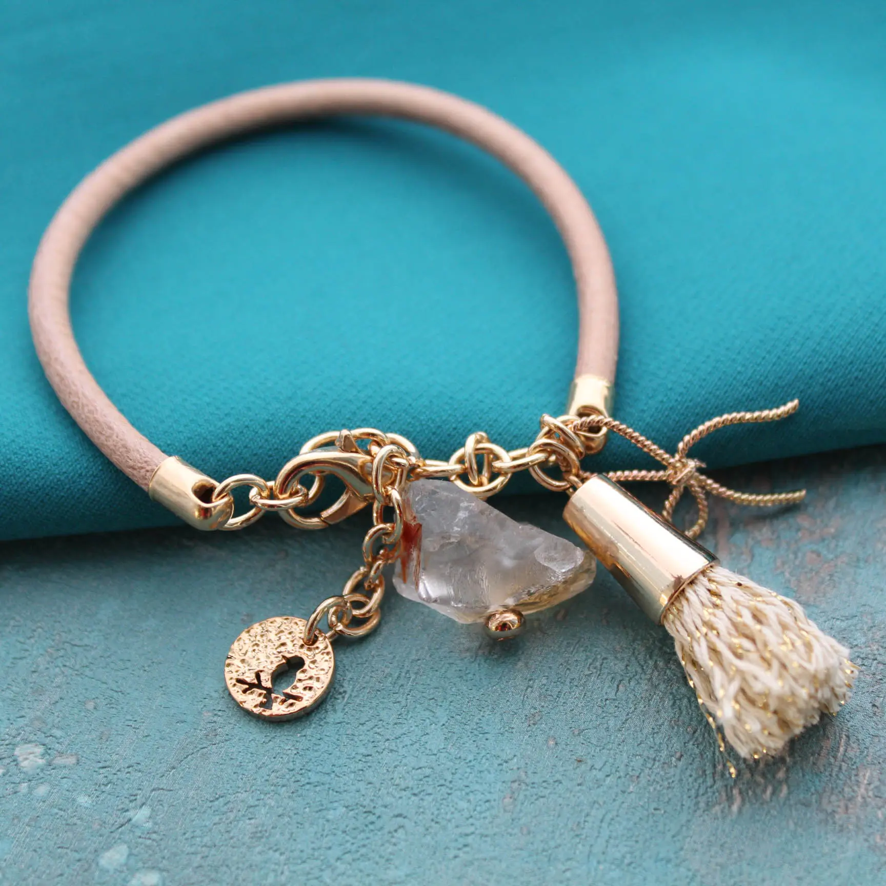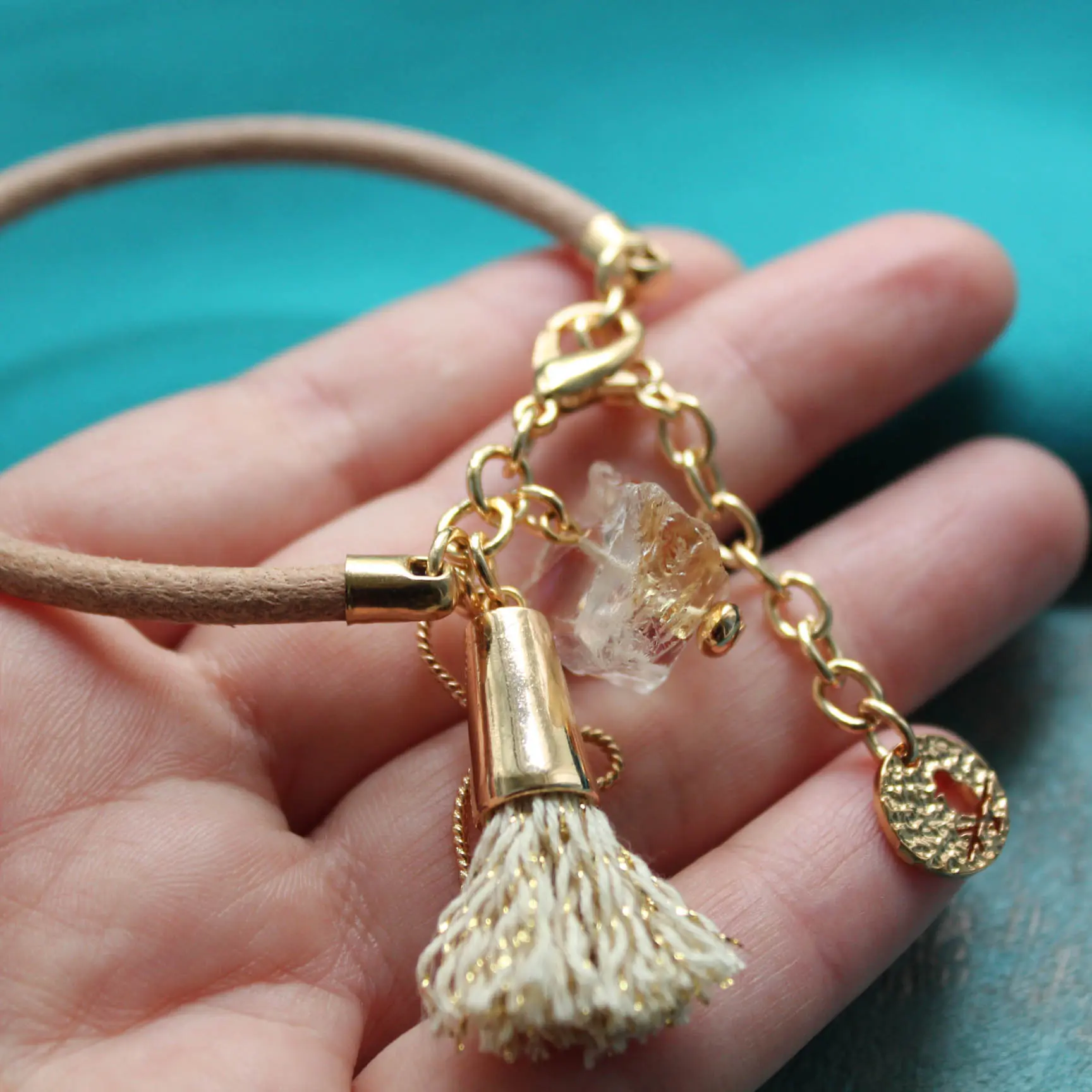 Браслет из скола натурального цитрина, кожи, кисточки из хлопковой нити с золотистым люрексом, позолоченной фурнитуры.