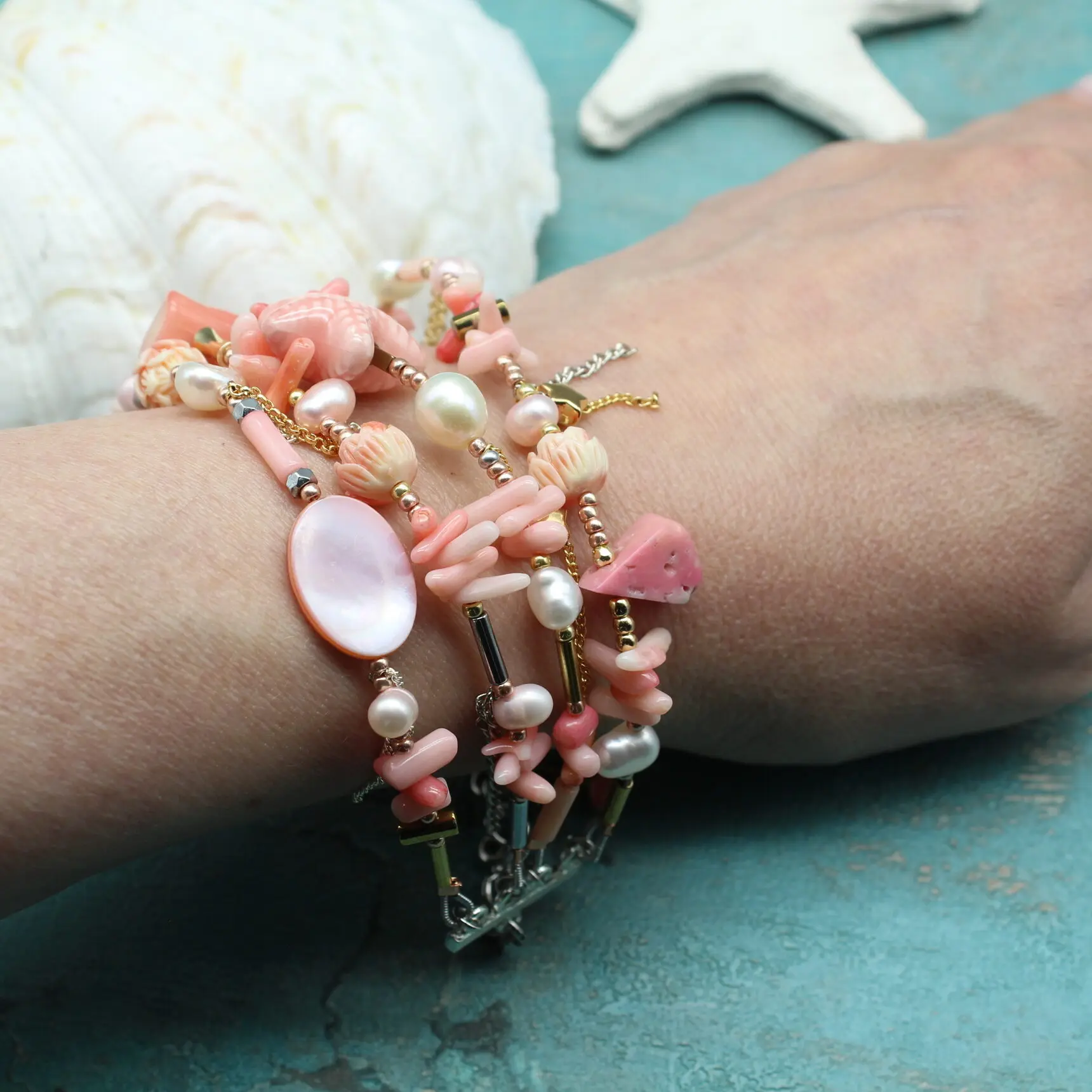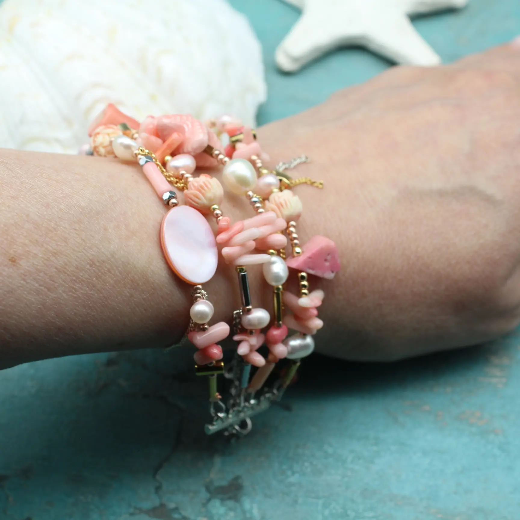 Браслет из натурального коралла, перламутра, жемчуга, керамики, цепочек.