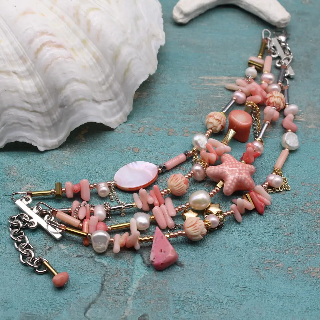Яркое, эффектное украшение из натурального коралла, перламутра, барочного жемчуга в актуальных трендах - с цепочками и разнообразными элементами в виде морских звездочек, цветов!