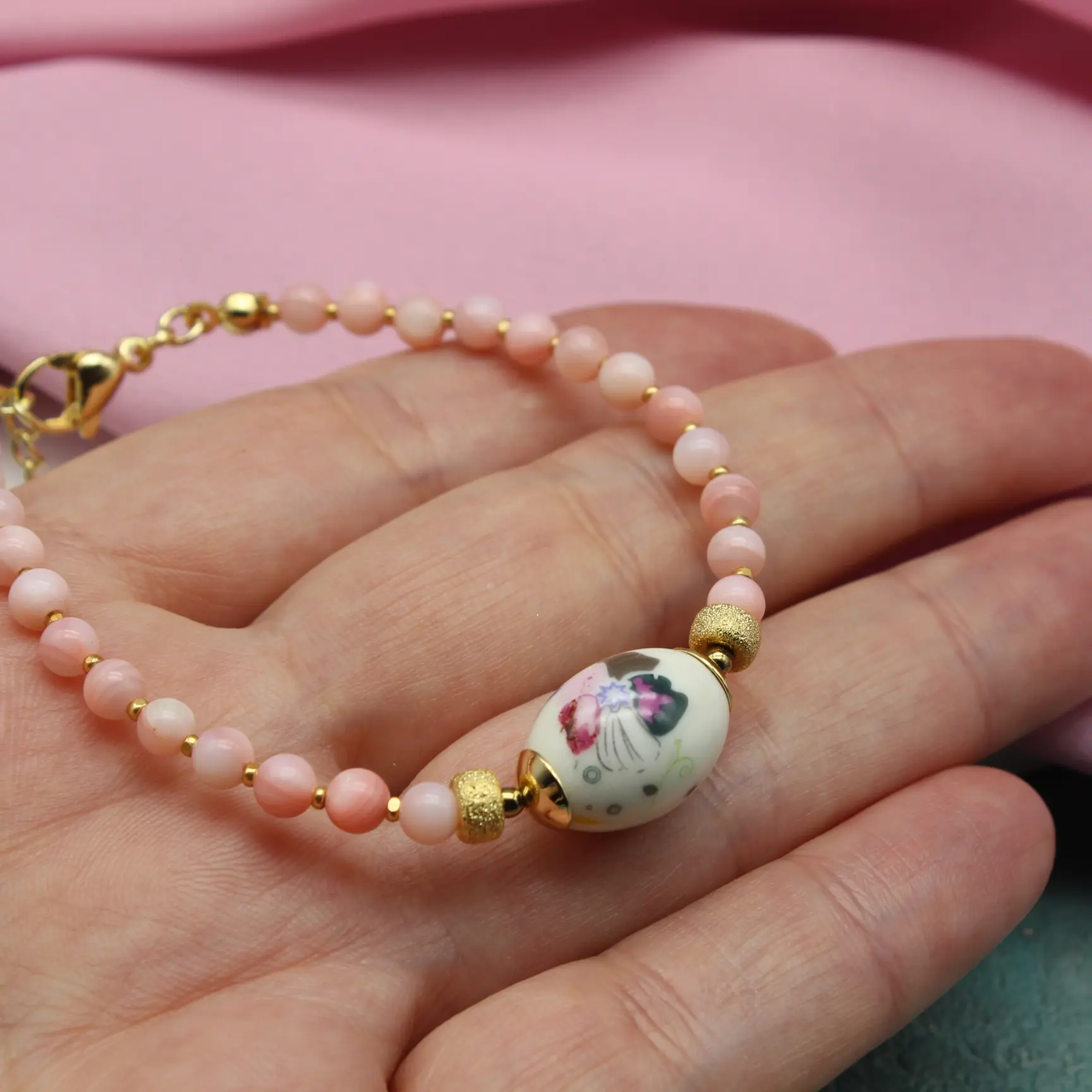 Колье-чокер из натурального розового перламутра, расписного фарфора, попозолоченной фурнитуры.