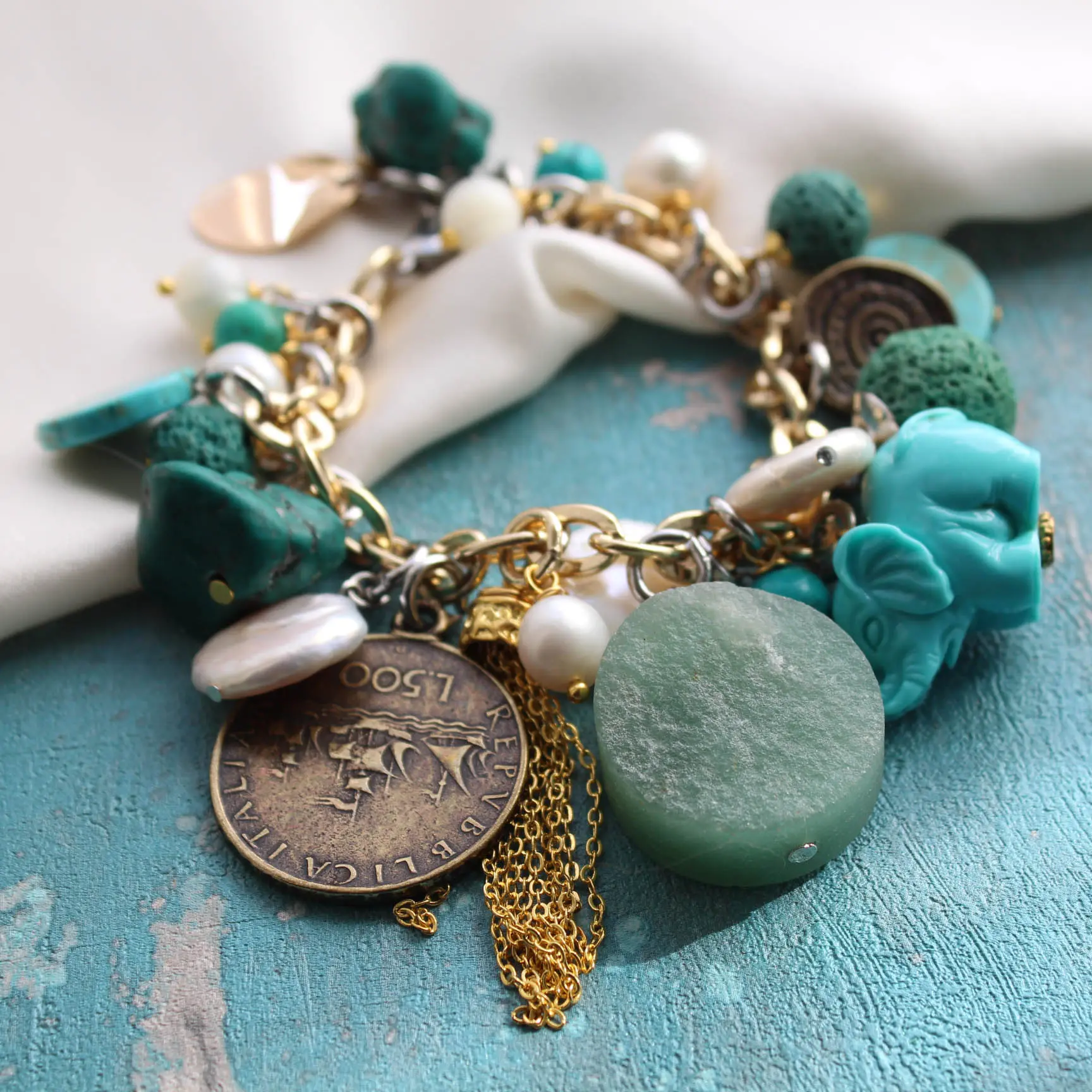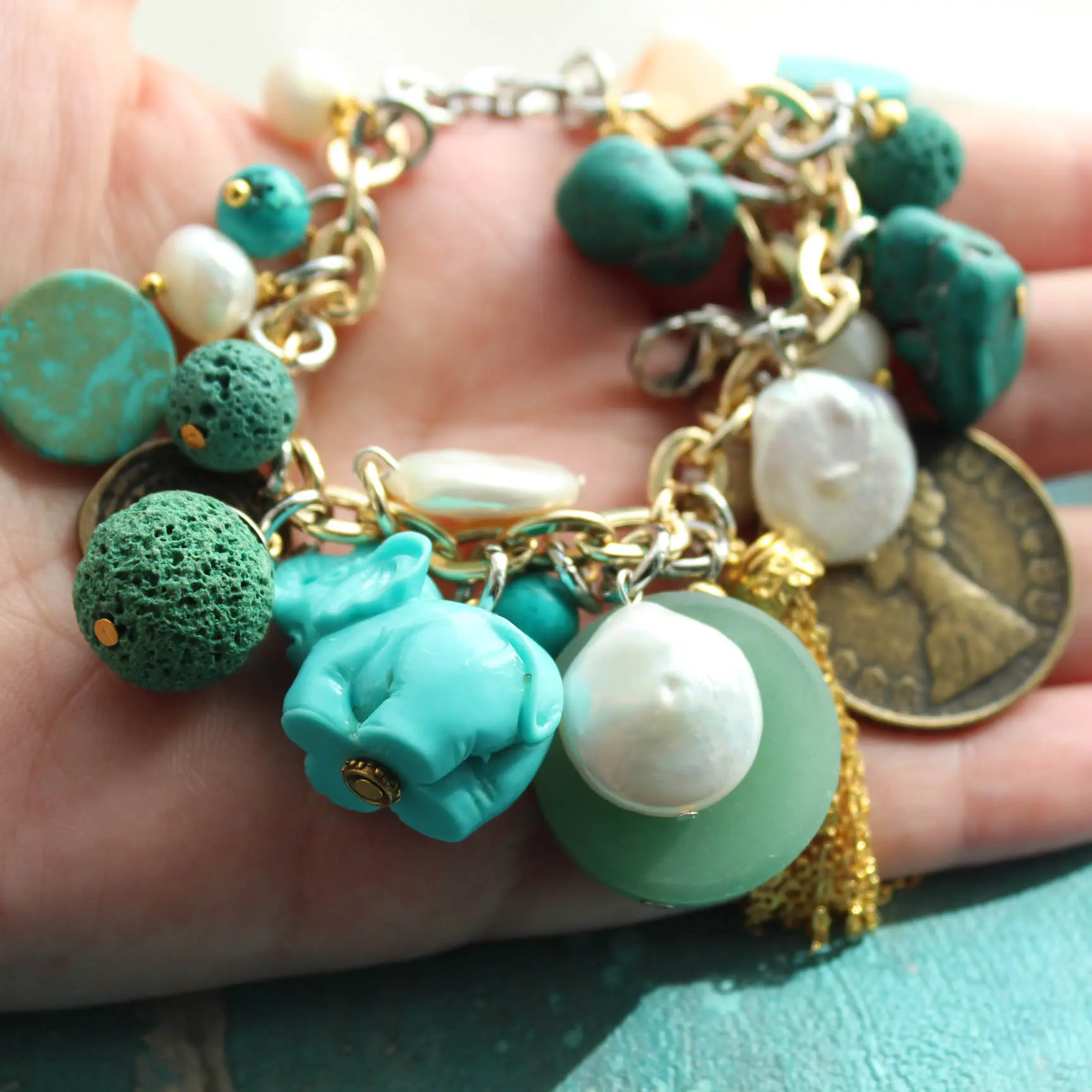 Браслет из натуральных жемчужин барокко, жемчуга, зеленой бирюзы (имитация из прирдного магнезита), прессованной бирюзы, нефрита, резного пластика в виде симпатичного слоника, винтажных монет.