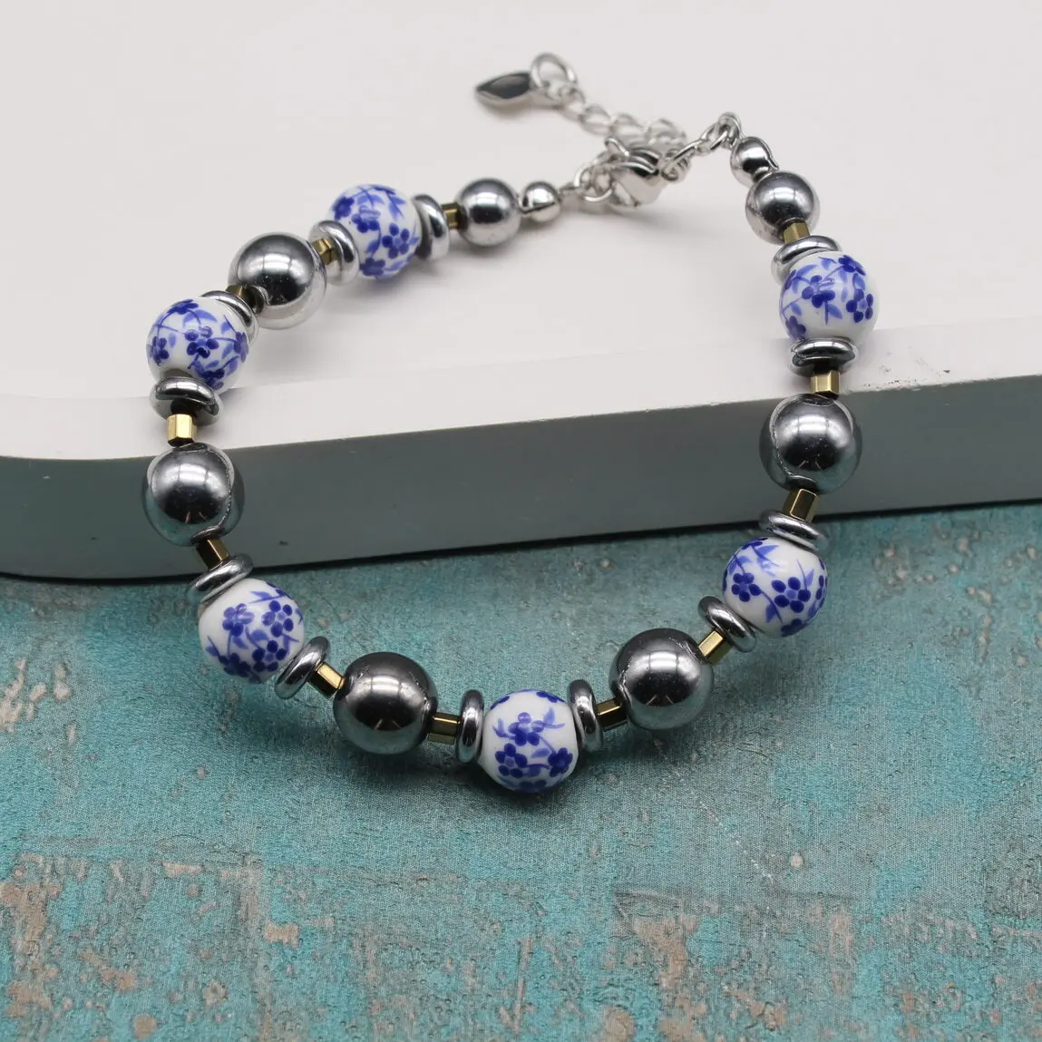 Браслет из расписного фарфора, гематита, посеребренной фурнитуры.