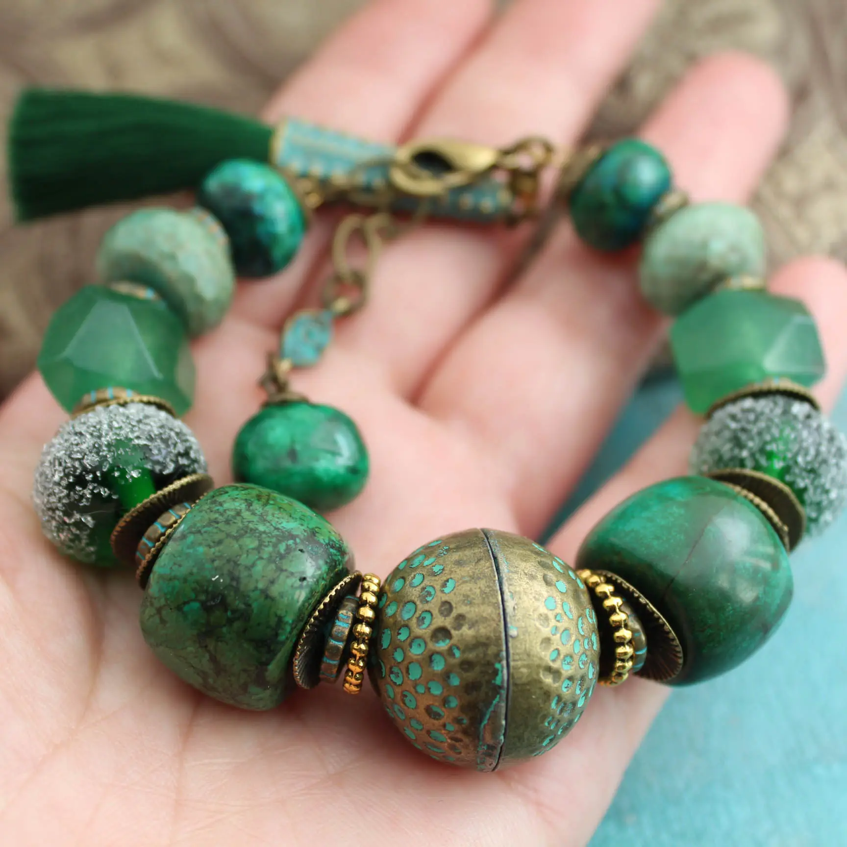 Потрясающее украшение! Необыкновенные камни, каждый с изумительной фактурой благородного зеленого цвета! Изумрудный оттенок объединил эти минералы, но, по-настоящему, украсила бирюза - темно-зеленая, роскошная, крупная! Подвеска в виде шелковой кисточки съемная!