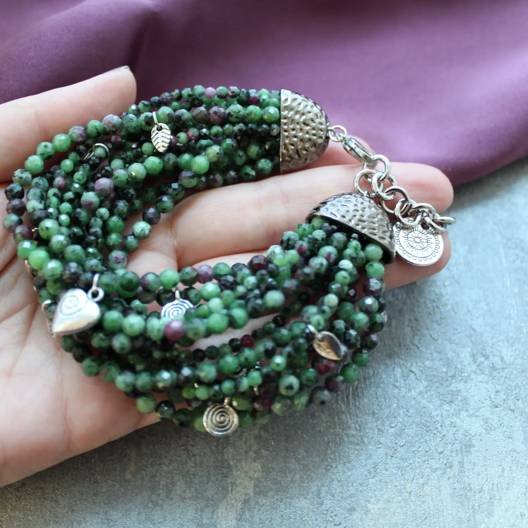 Широкий браслет из рубиноциозита, рубина, посеребренной фурнитуры.