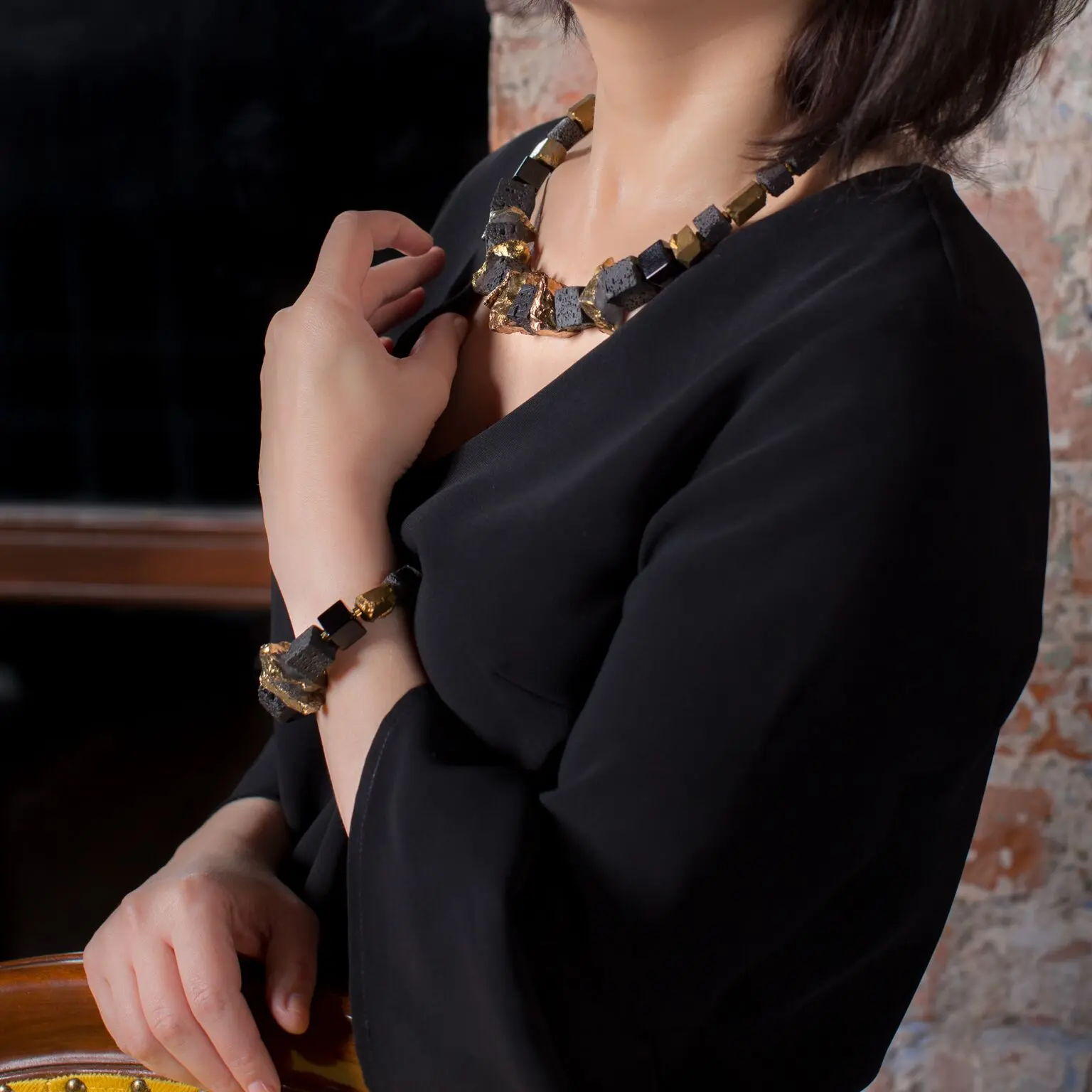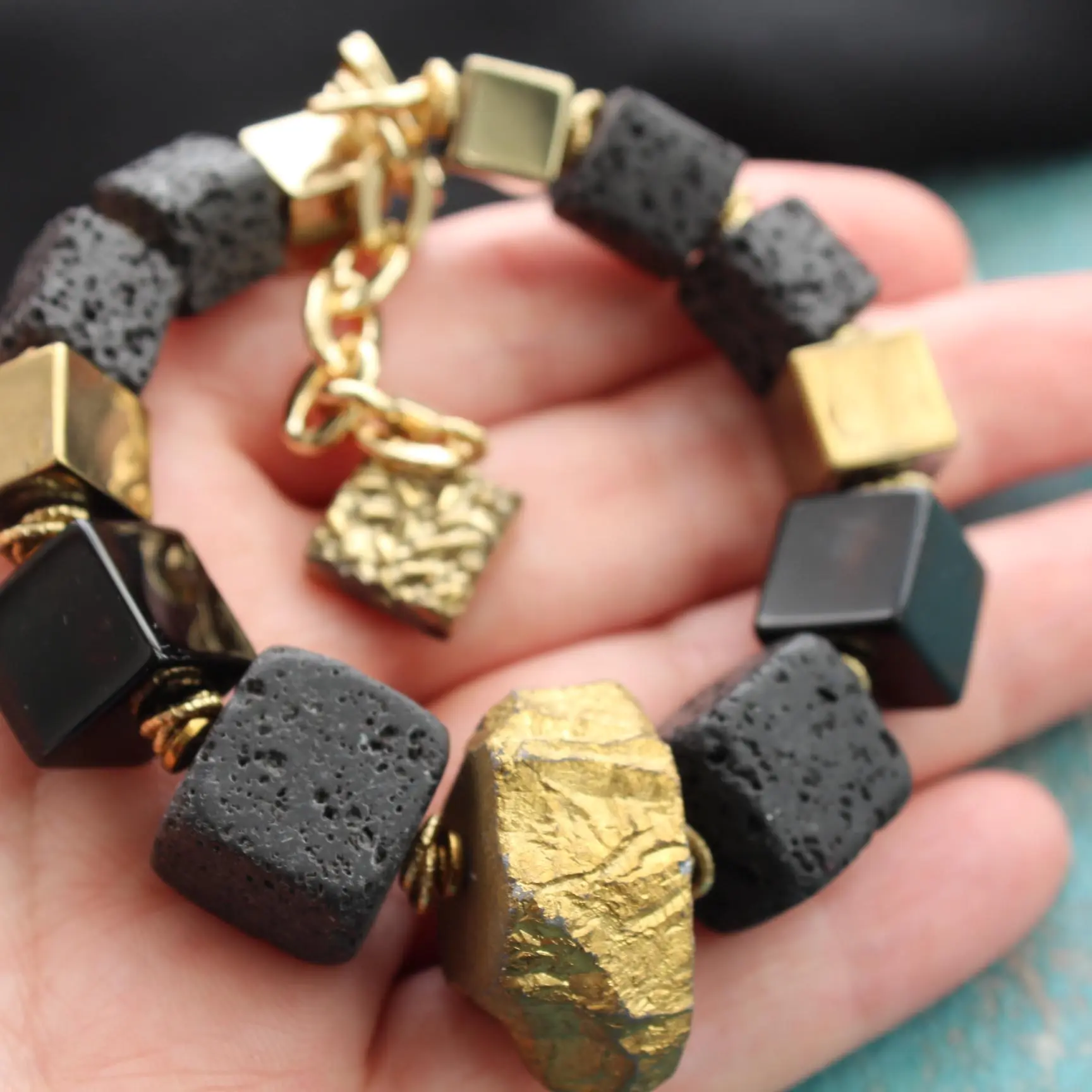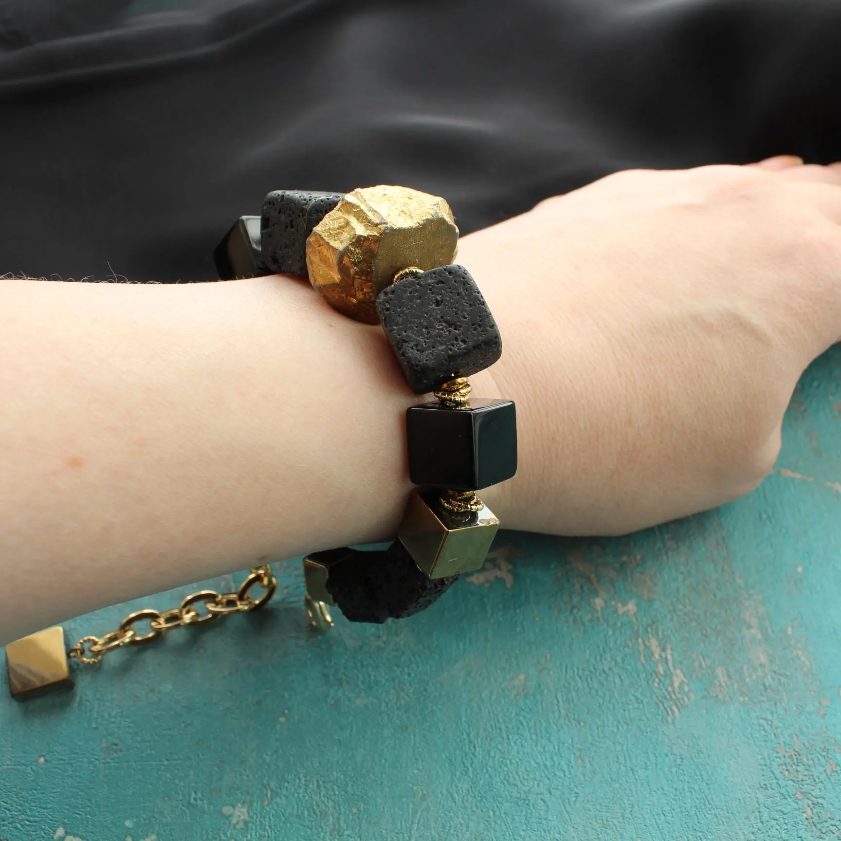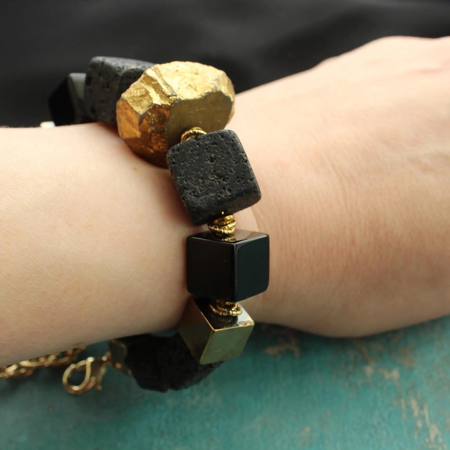 Браслет из натурального кварца с золотым напылением, океанической лавы, черного агата, гематита.