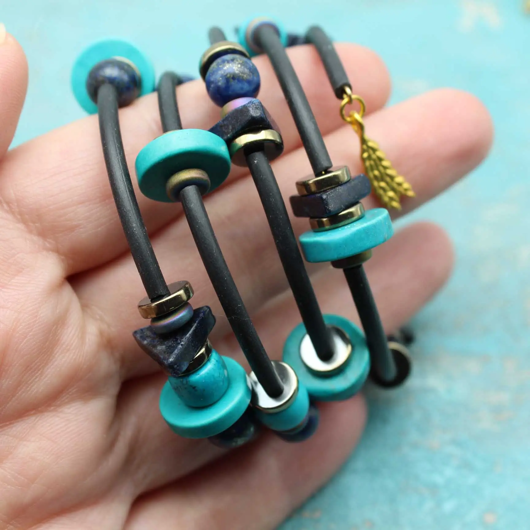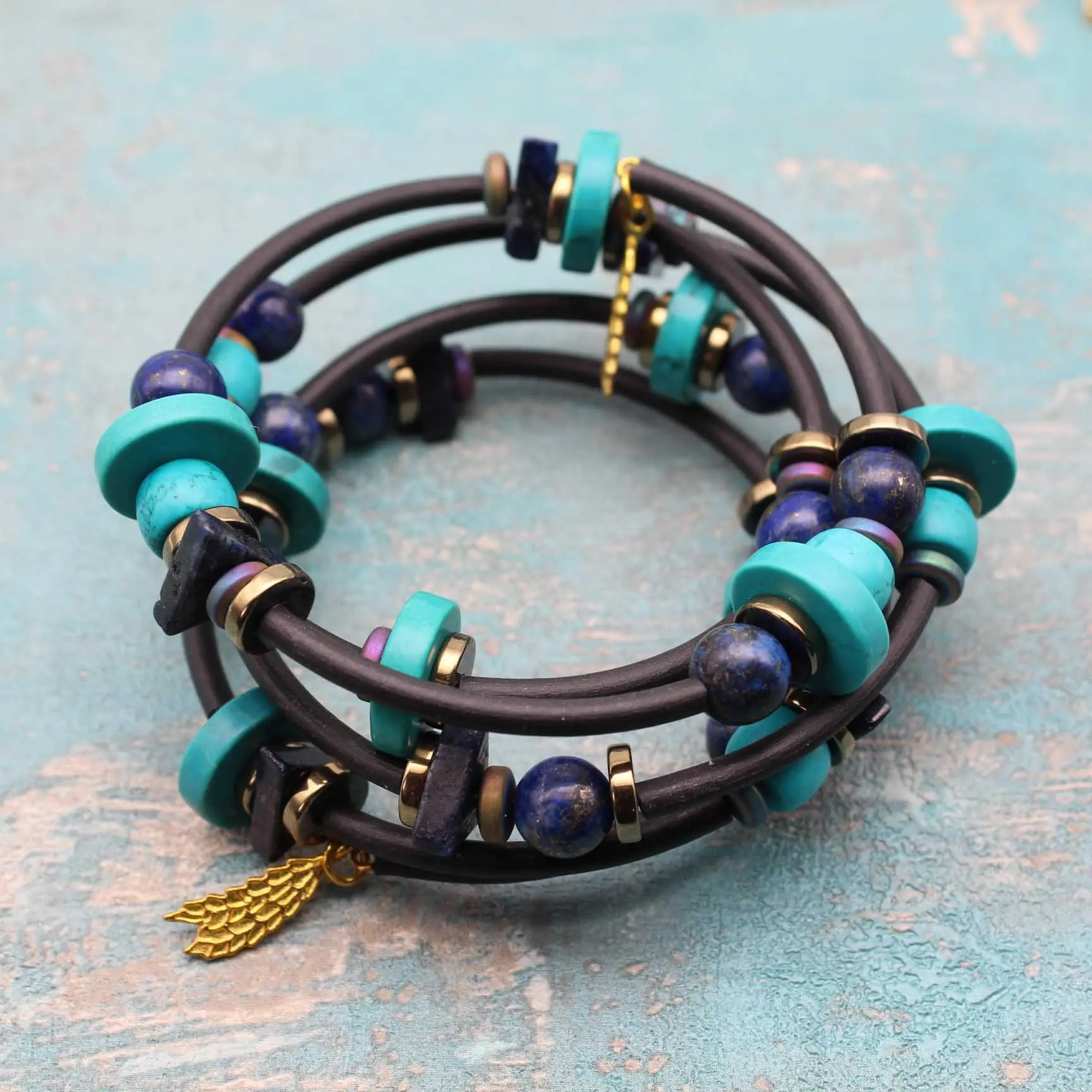 Браслет намотка из натурального лазурита, бирюзы, гематита, каучука.