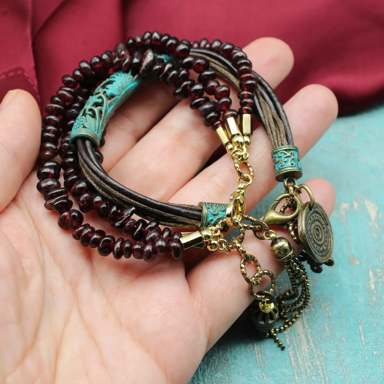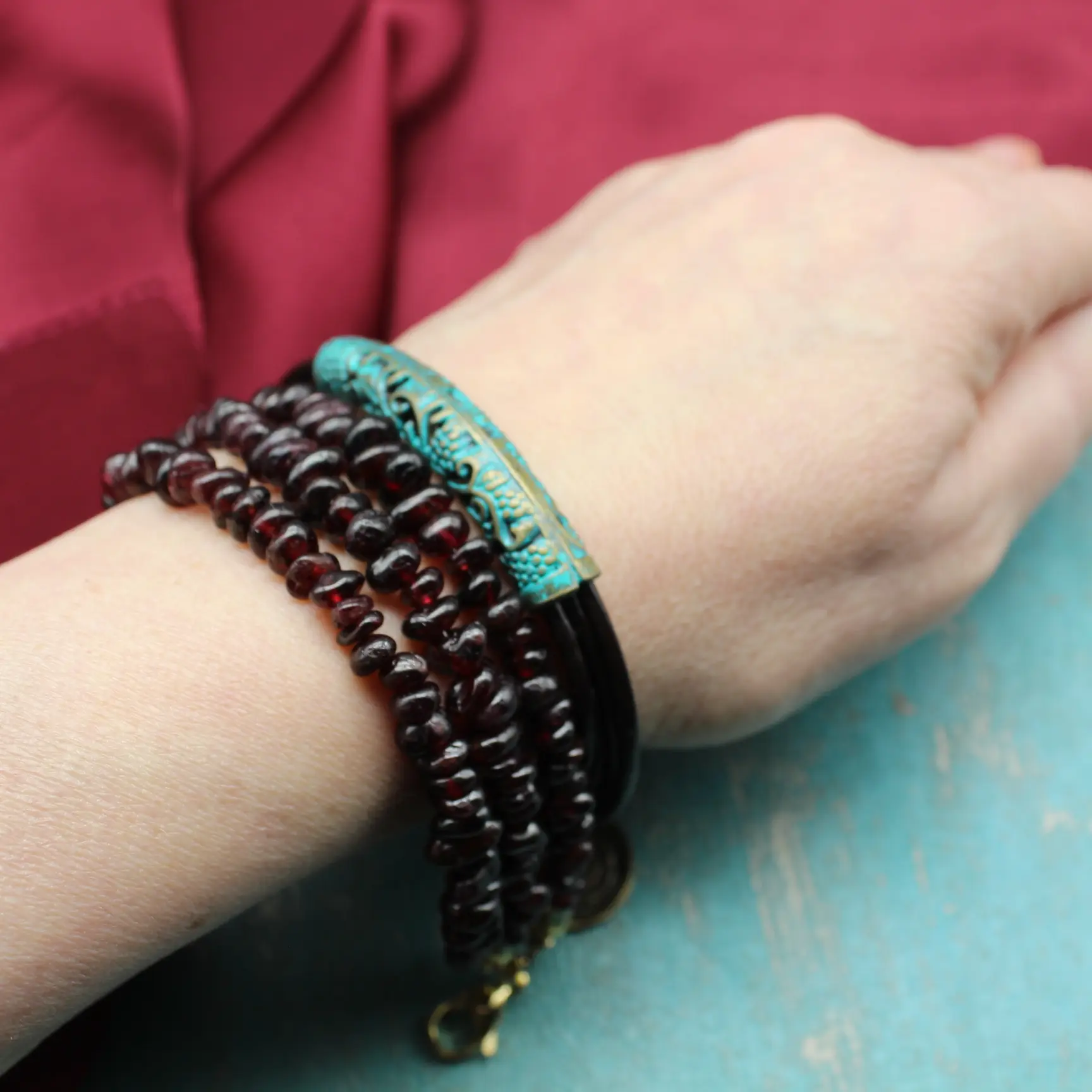 Сет из двух браслет из натурального граната, кожи, латуни с бирюзовой патиной, бронзы.
