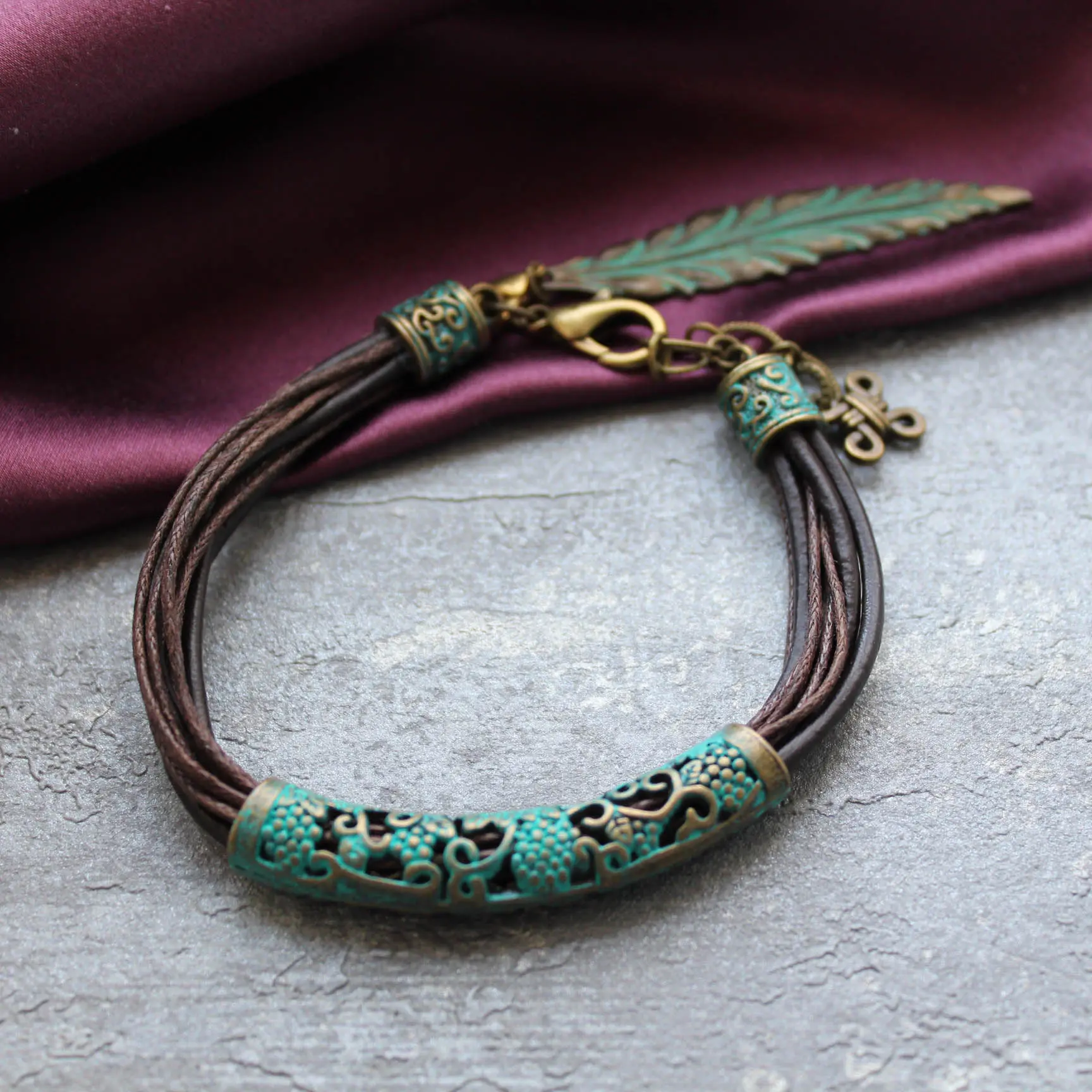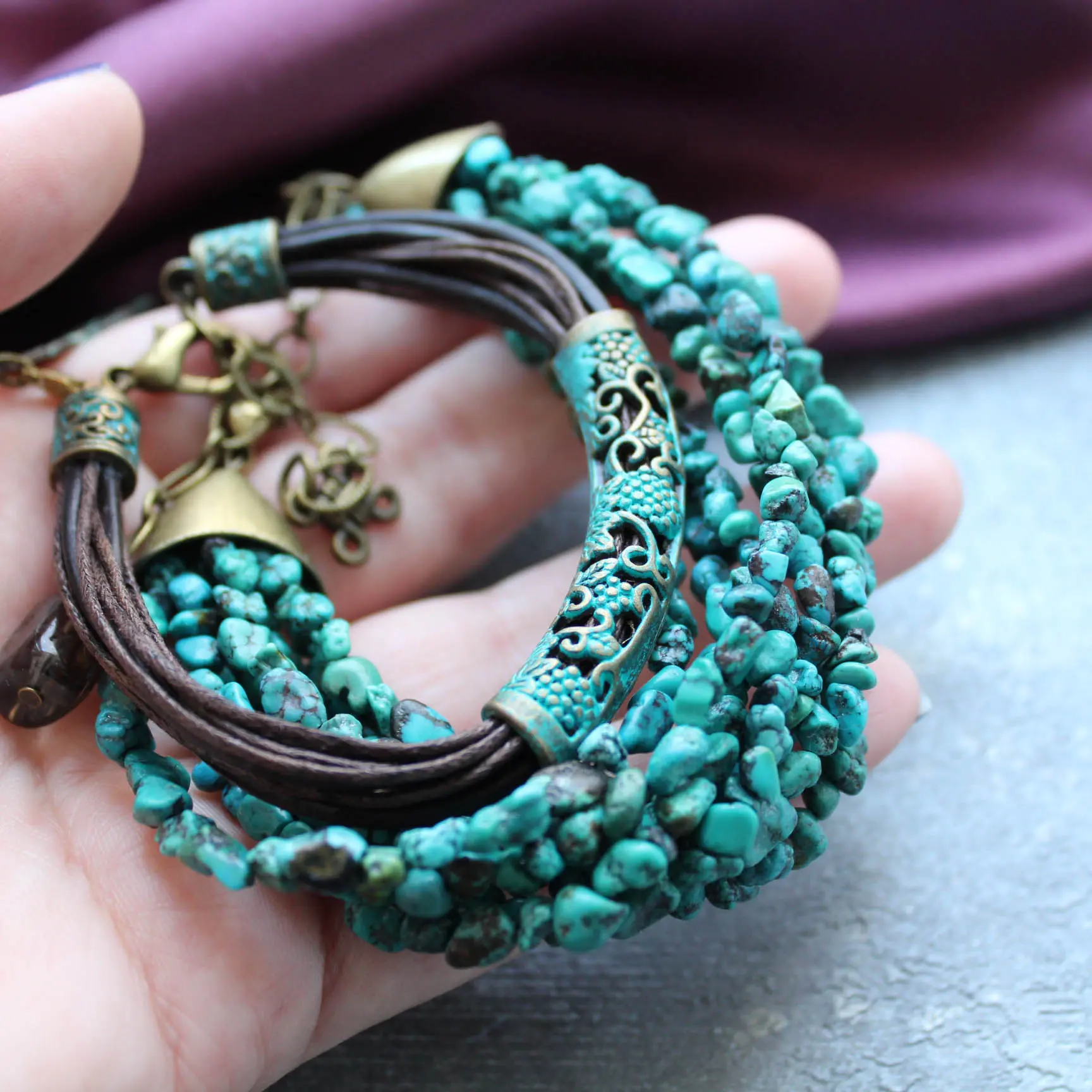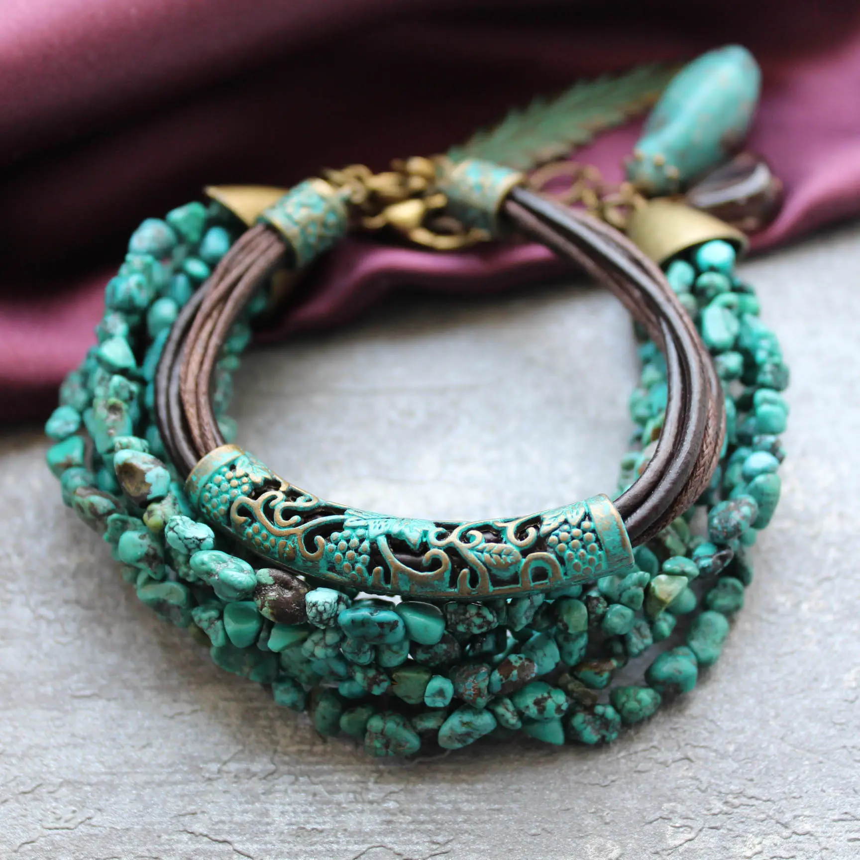 Браслет из натуральных самородков бирюзы (Аризона, США), кожи, хлопка, бронзы.