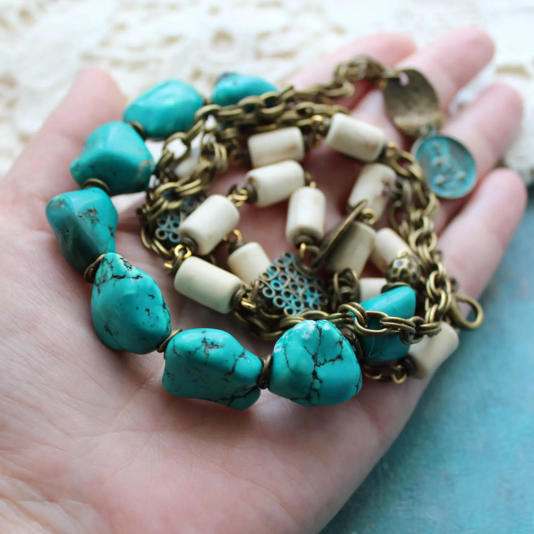 Размер бусин из резной кости 8*12 мм, самородков бирюзы 15*20 мм.