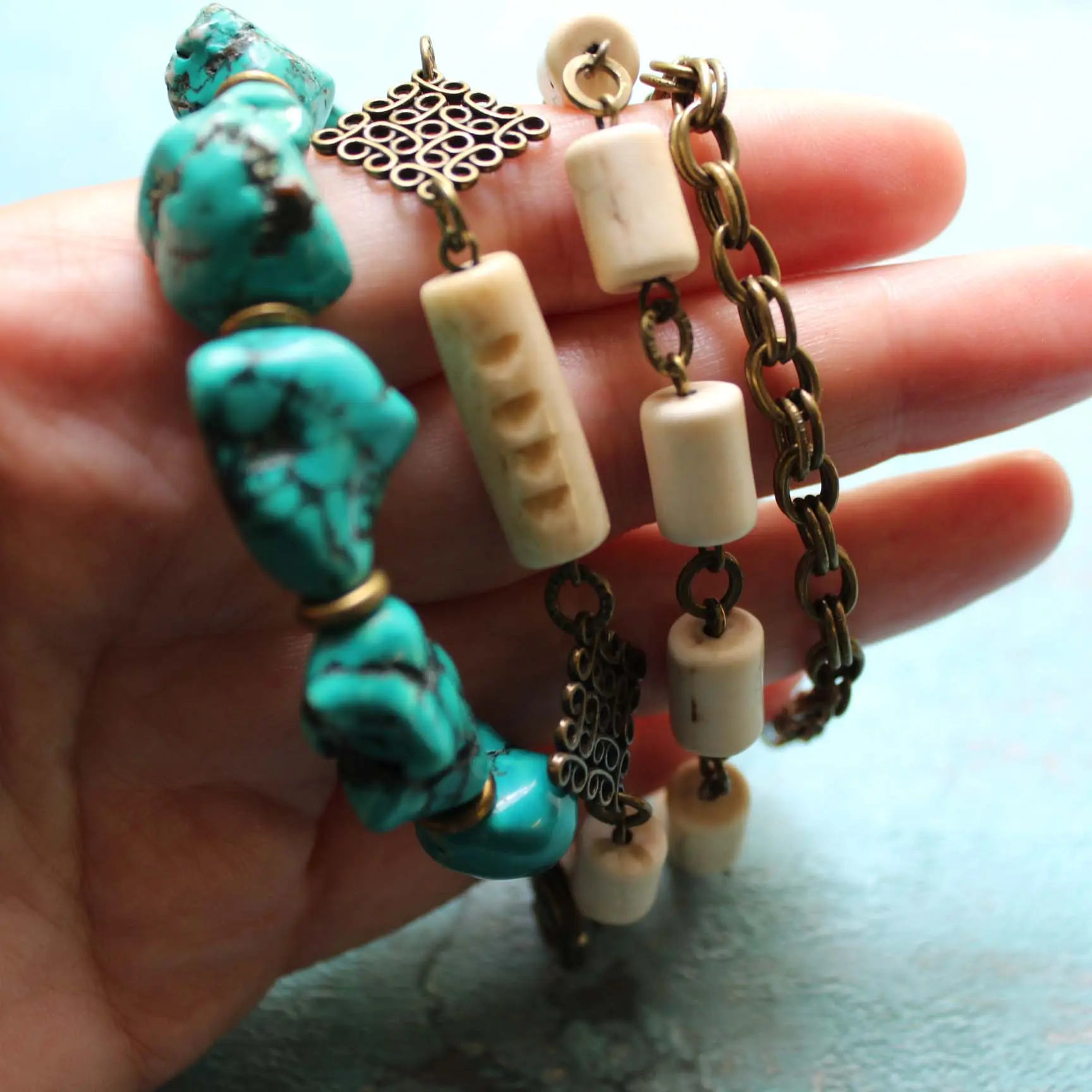 Браслет из зеленой бирюзы (самородки говлита), обработанного говлита, бронзовой и латунной фурнитуры.
