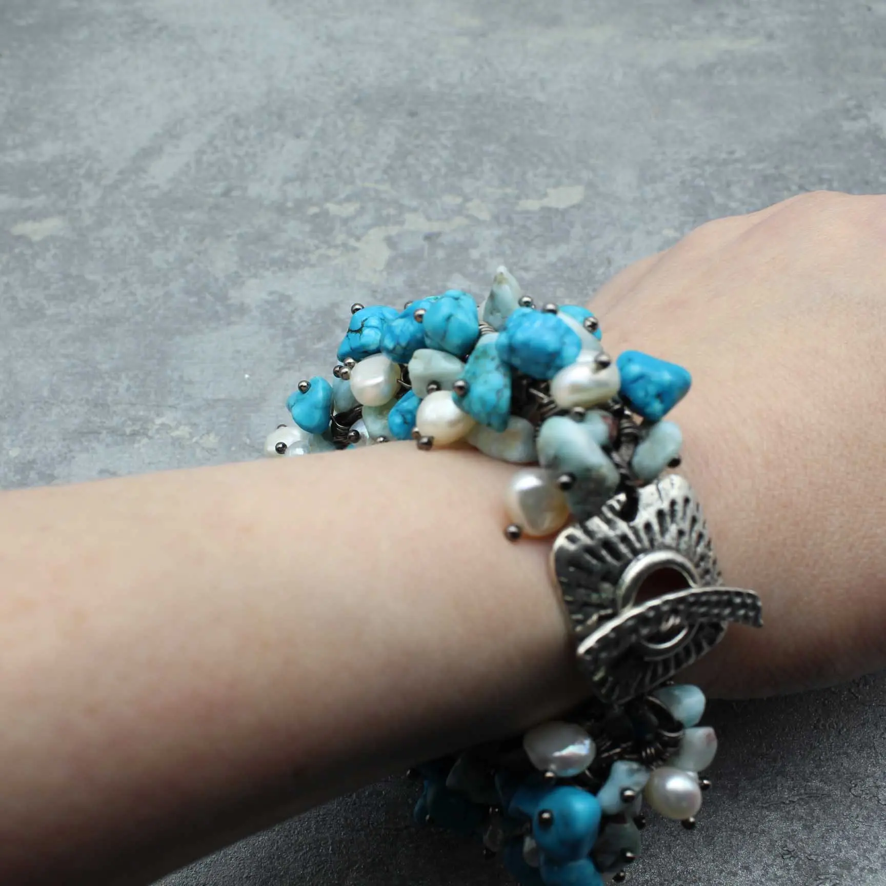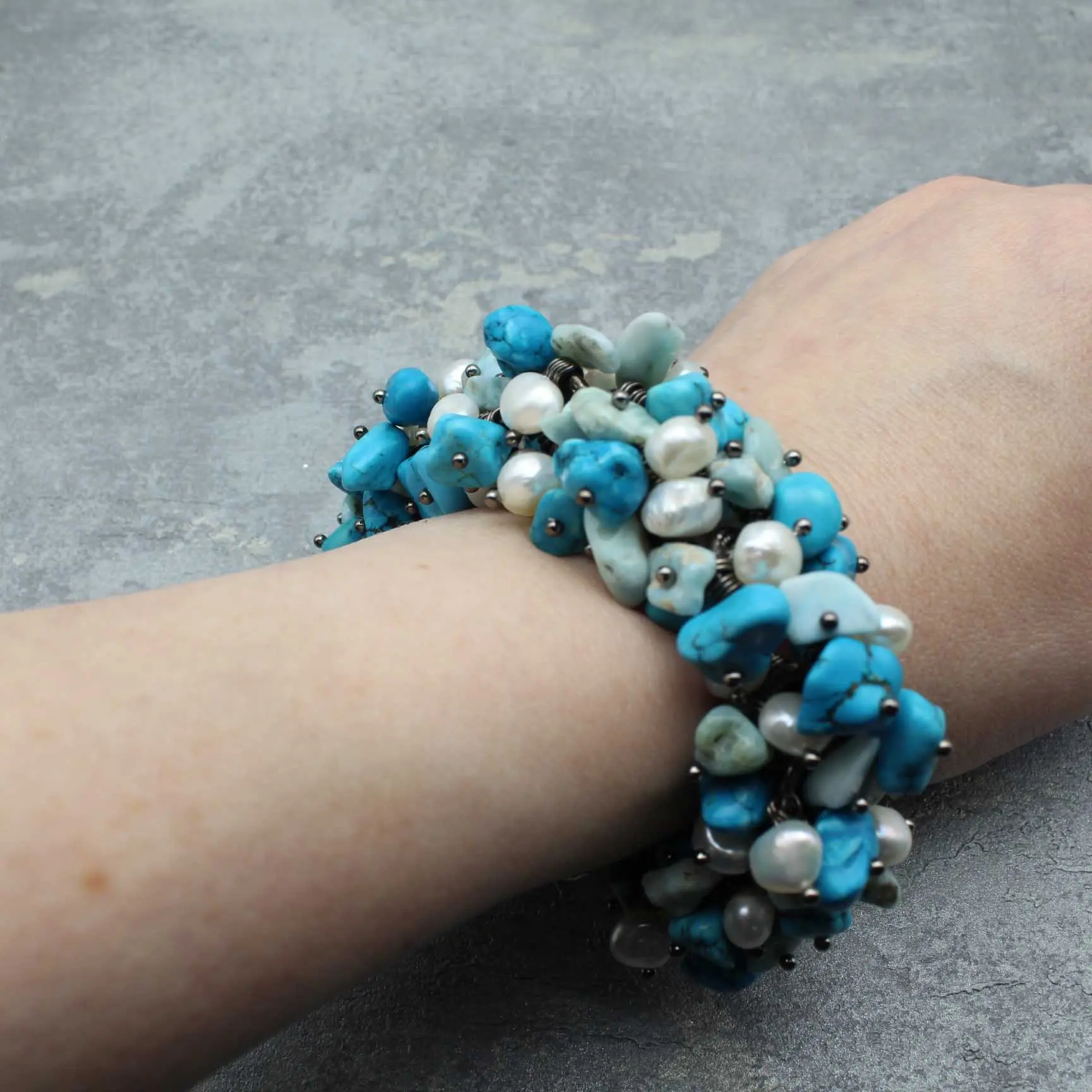 Браслет из самородков бирюзы (говлита), ларимара, жемчуга формы "барокко".