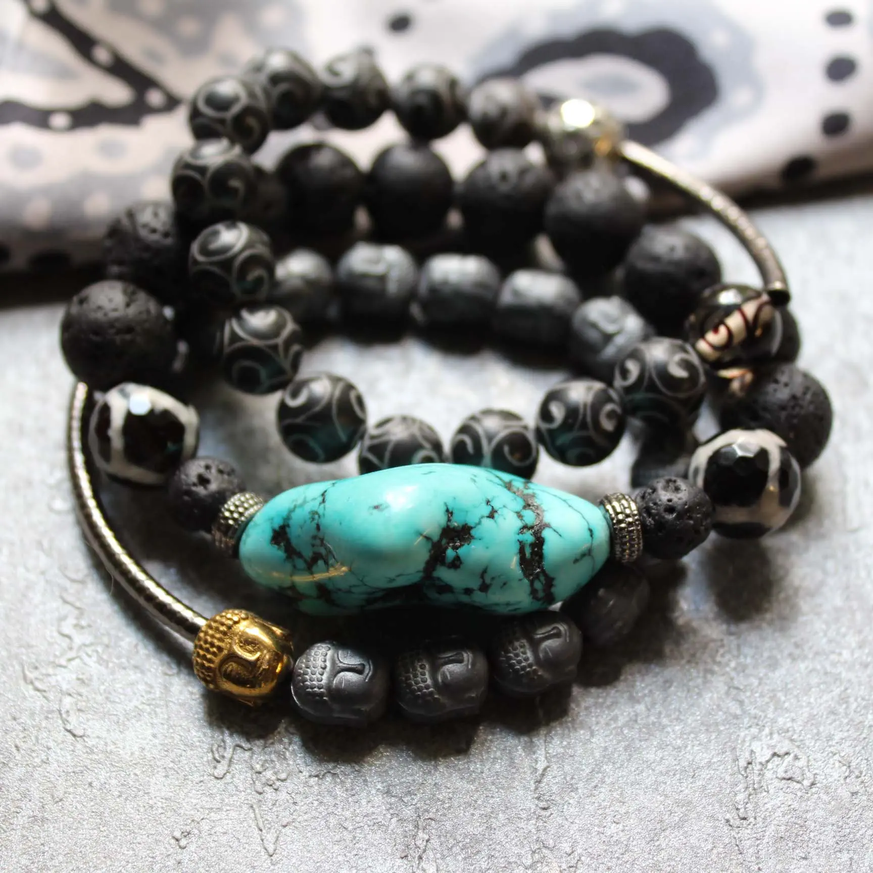 Браслеты из самородка бирюзы (турквенита), резного агата, расписного стекла, резного гематита в виде головы Будды, агата дзи, лавы.