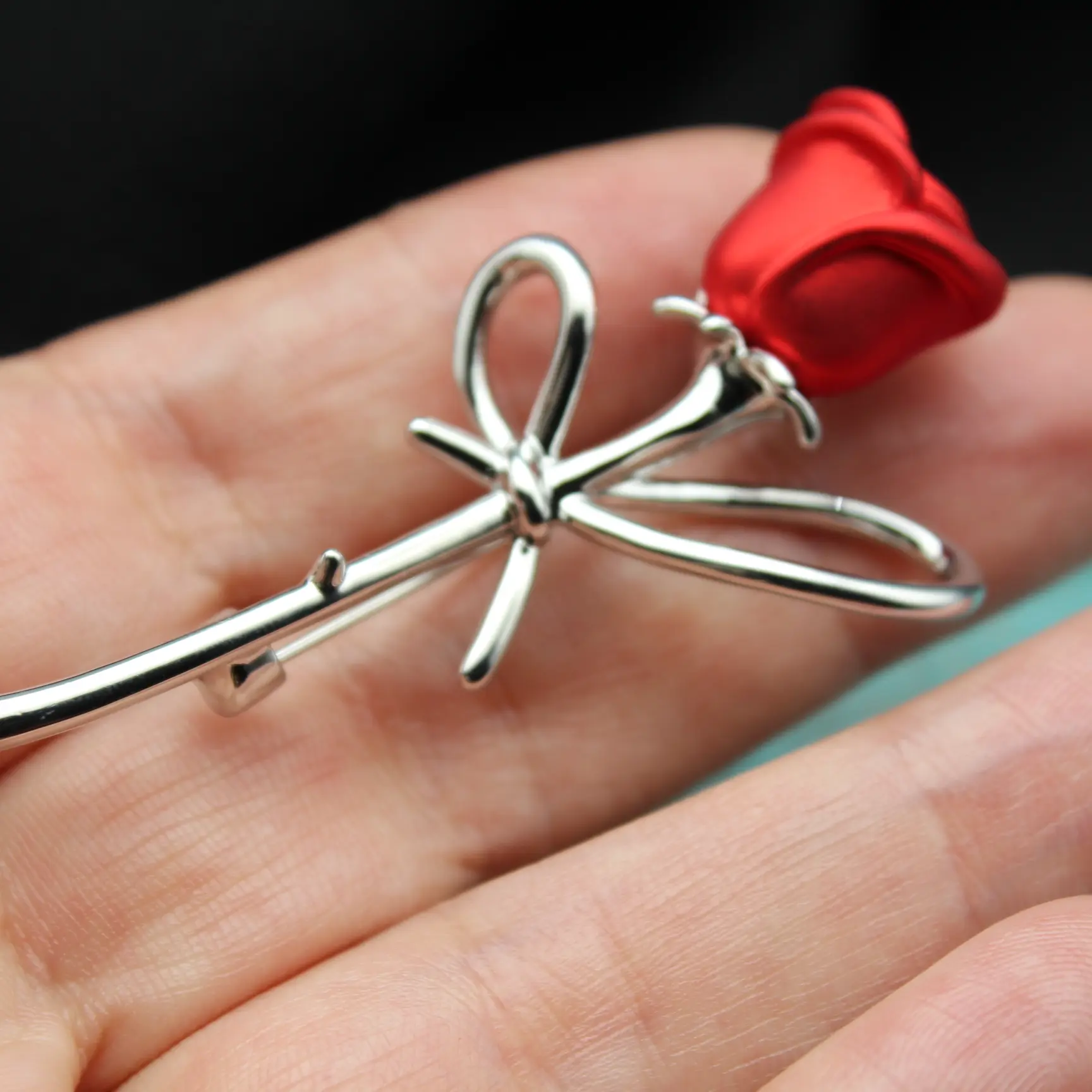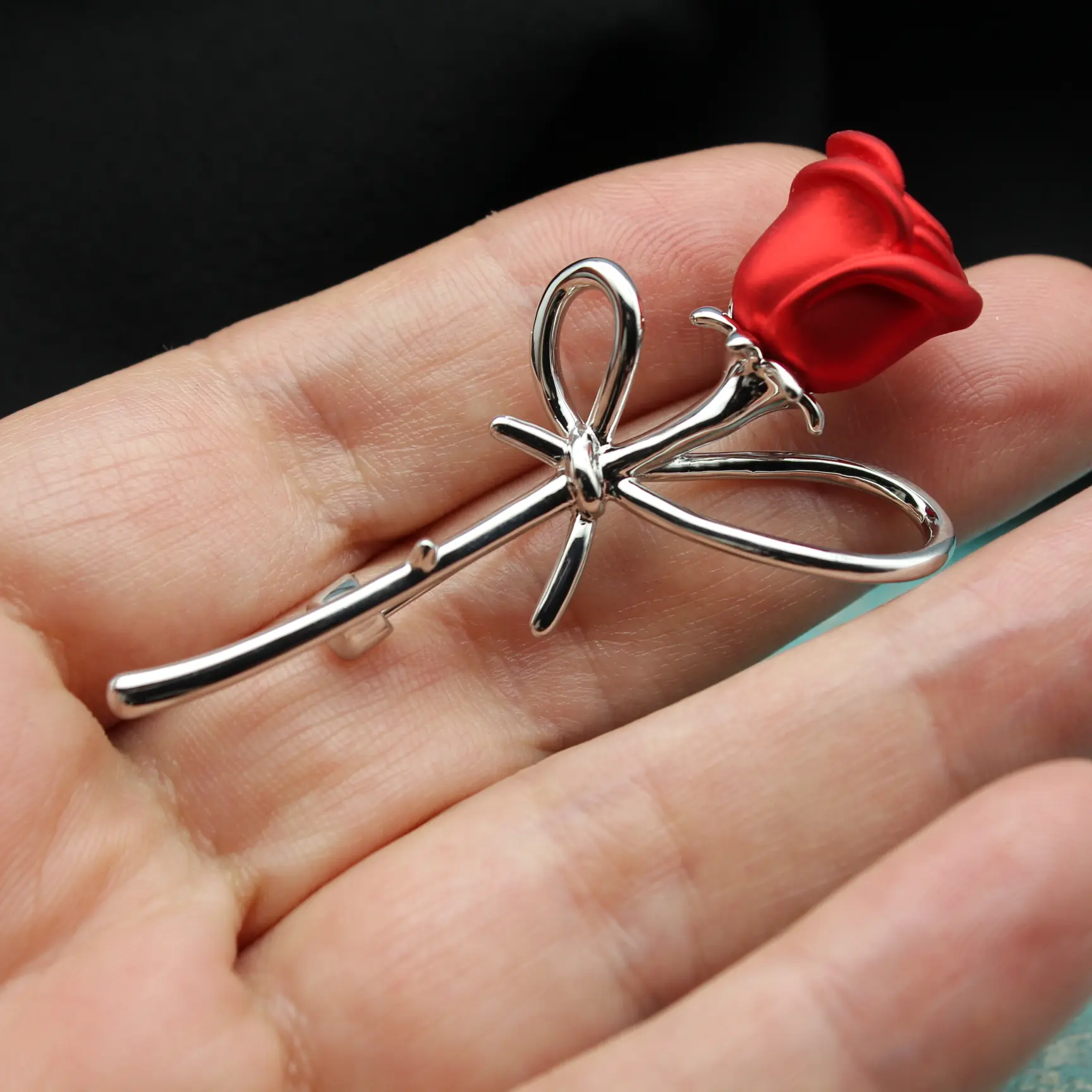 Брошь в виде розы из серебристого металла, красной эмали.