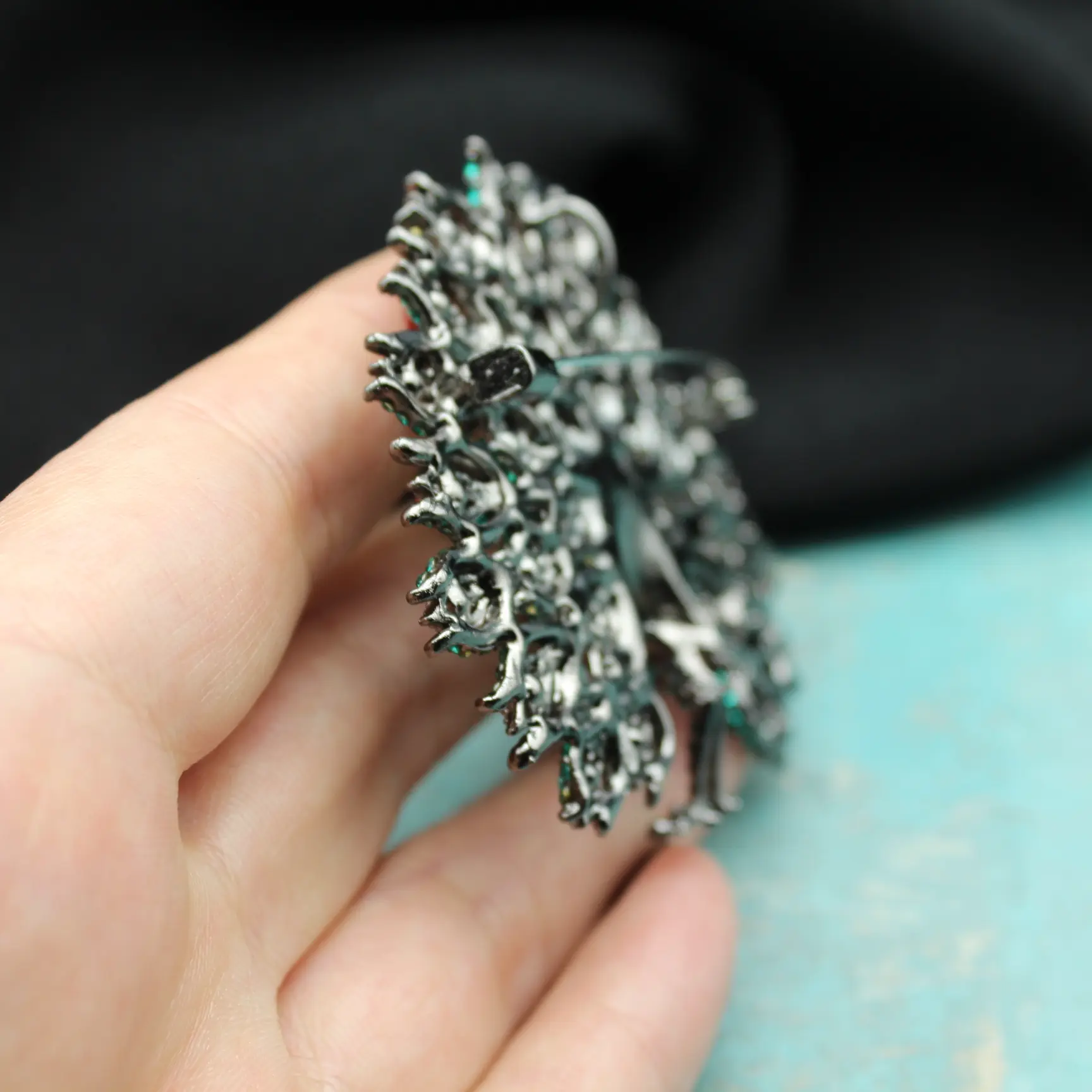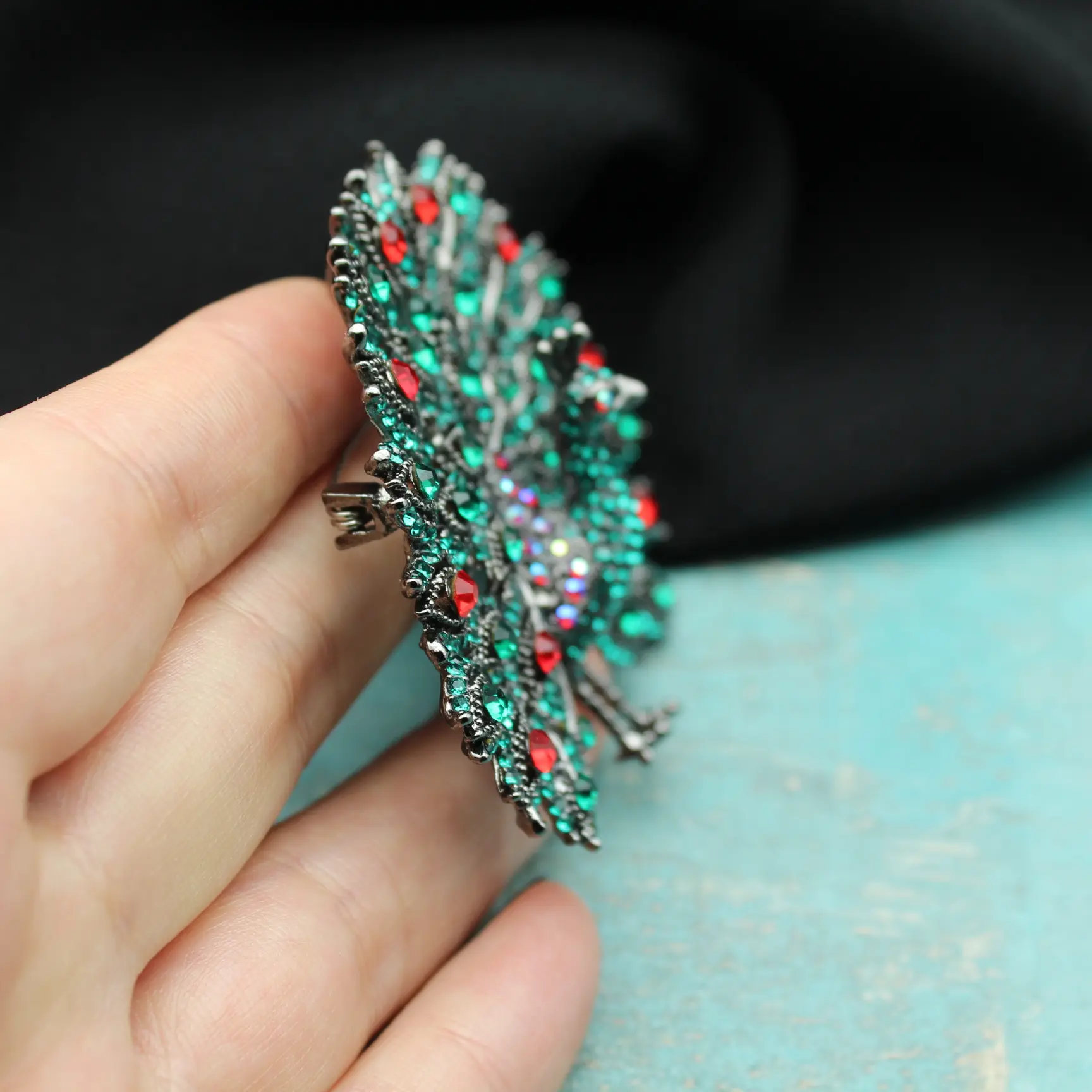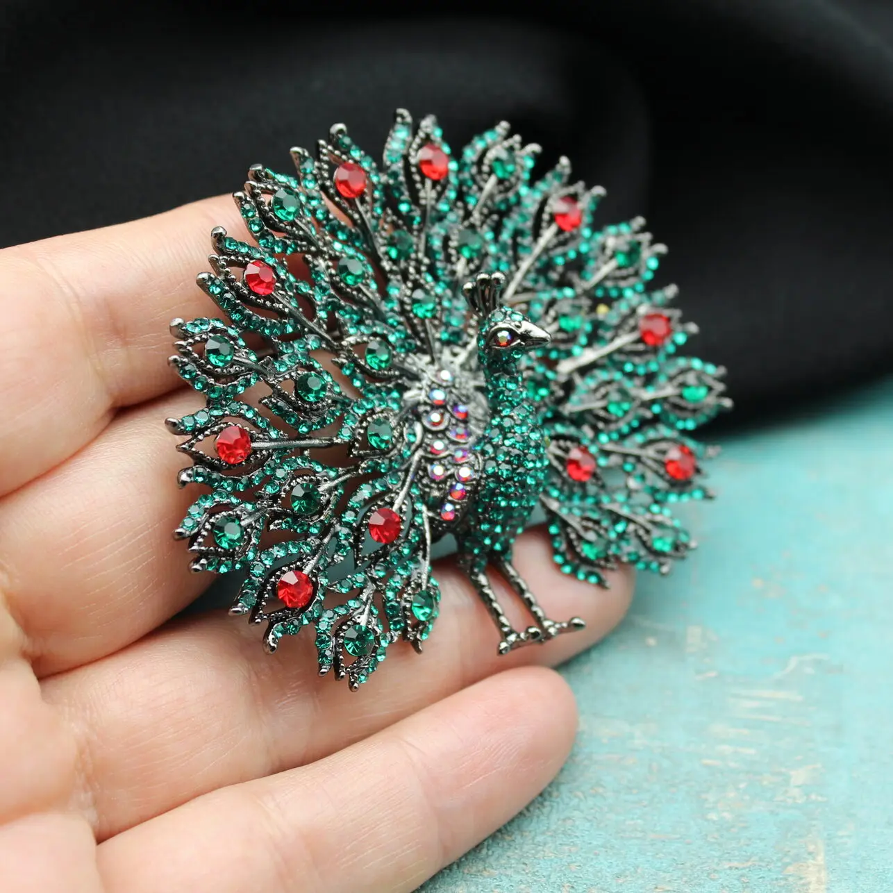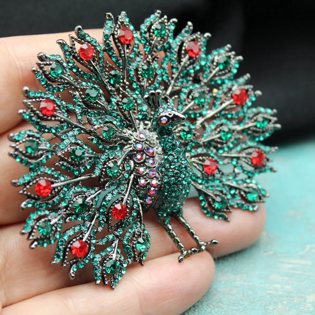Брошь-подвеска в виде необыкновенного объемного павлина из изумрудных, красных, радужных страз, металлического сплава.