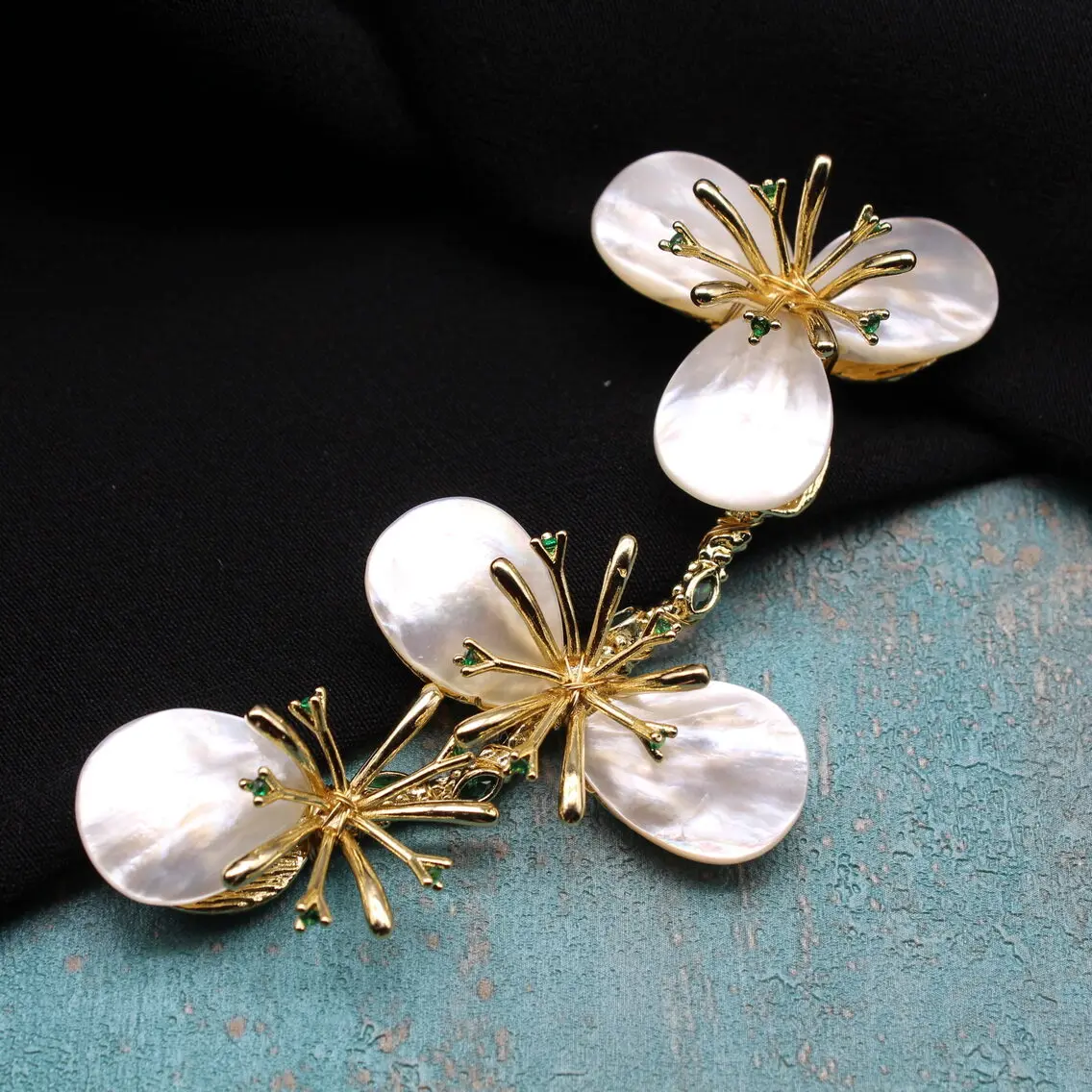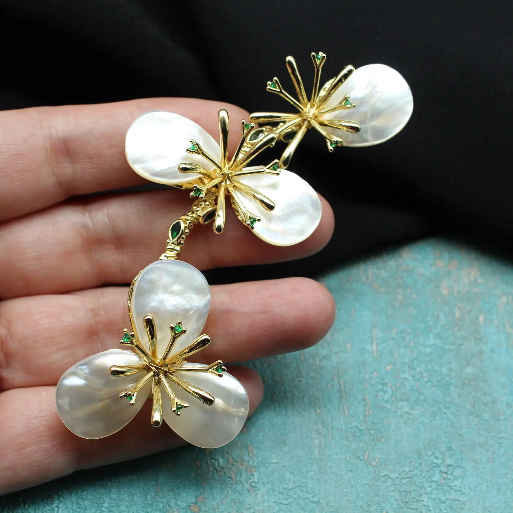 Брошь - подвеска из натурального белоснежного перламутра, изумрудных страз, позолоченной латуни, в виде веточки с цветами.