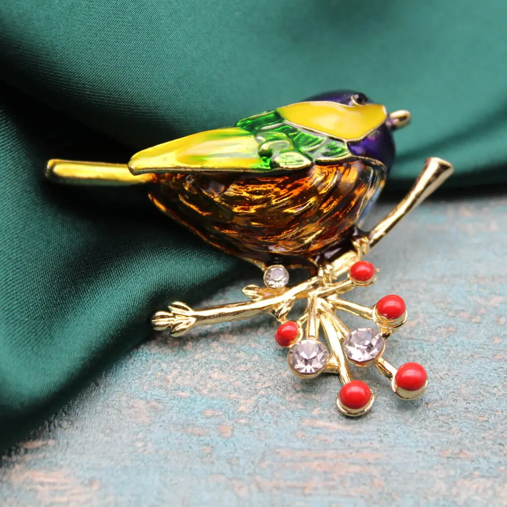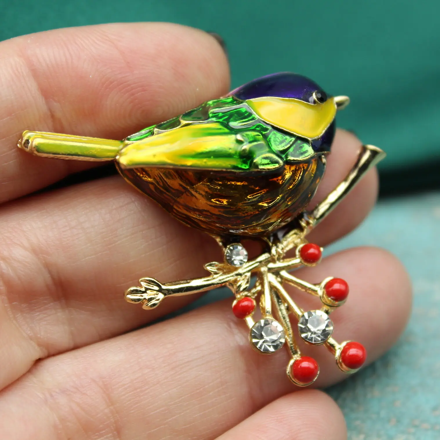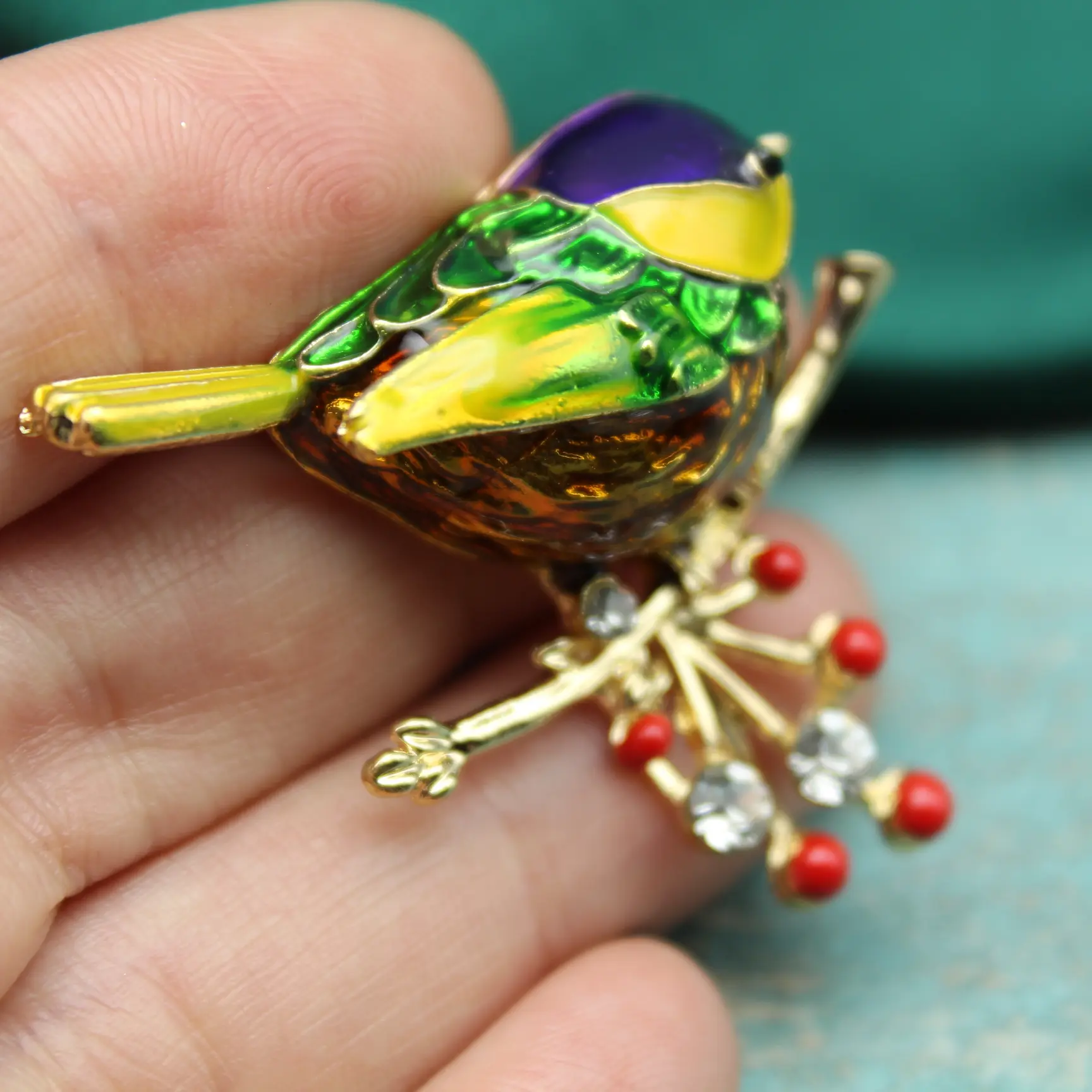 Брошь в виде птички синички с цветной эмалью, кристаллами, золотистого сплава.