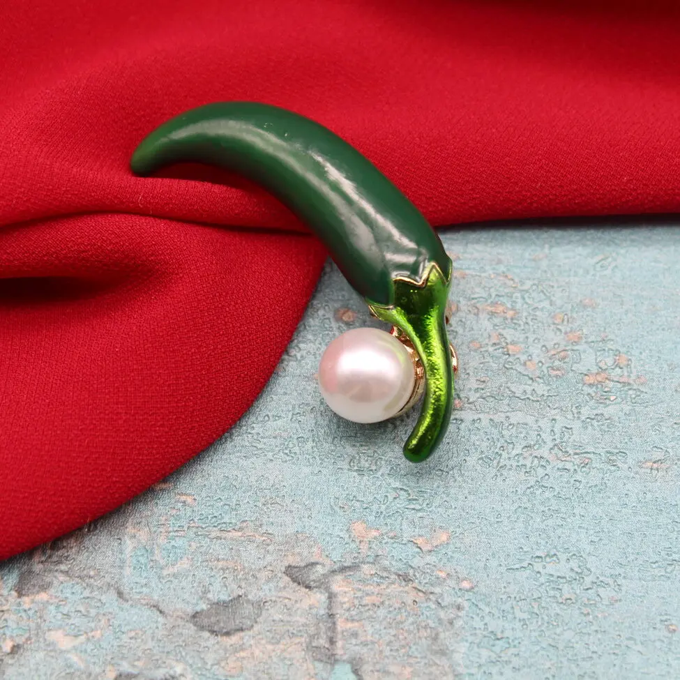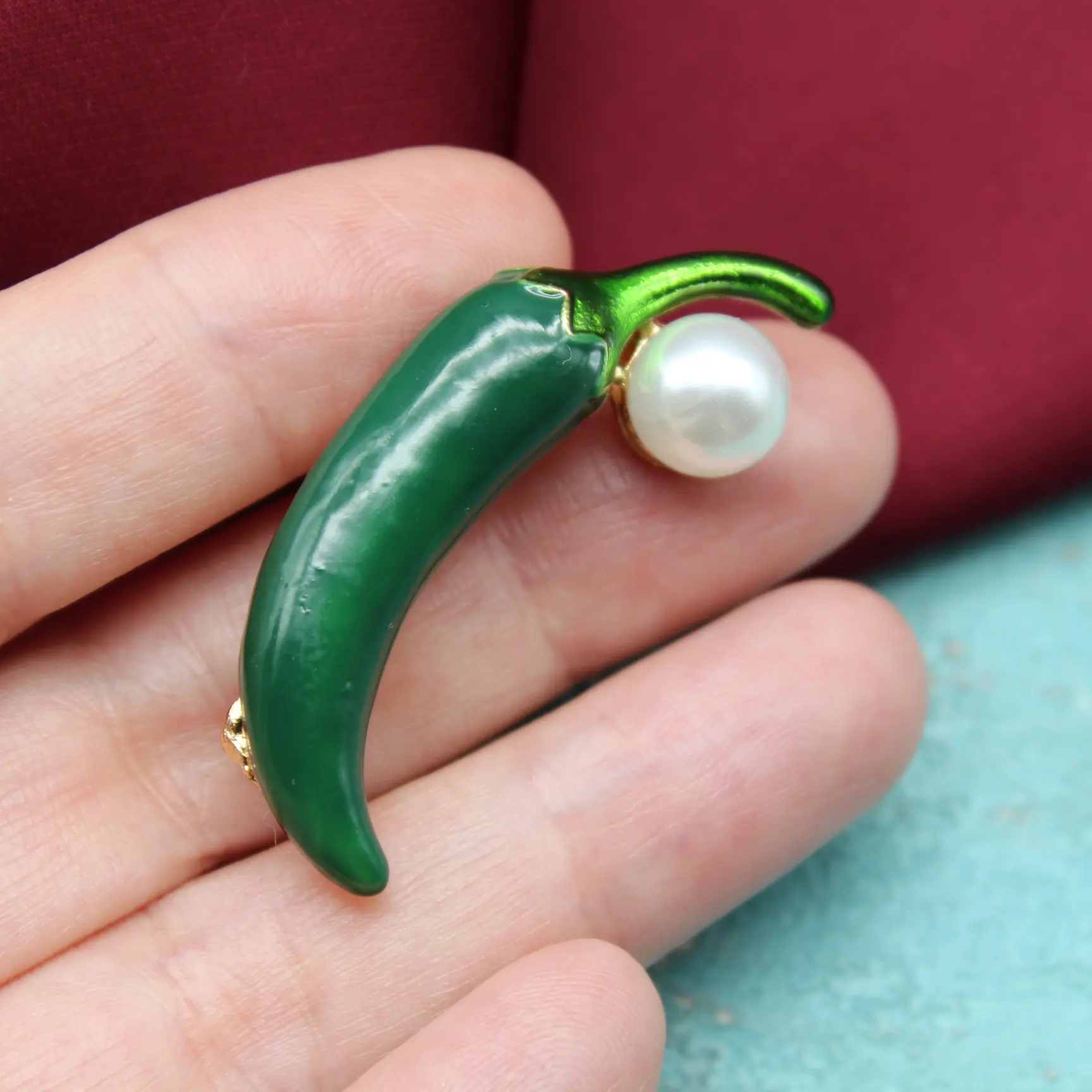 Брошь в виде зеленого перчика чили из золотистого металлического сплава, жемчуга майорки и зеленой эмали.